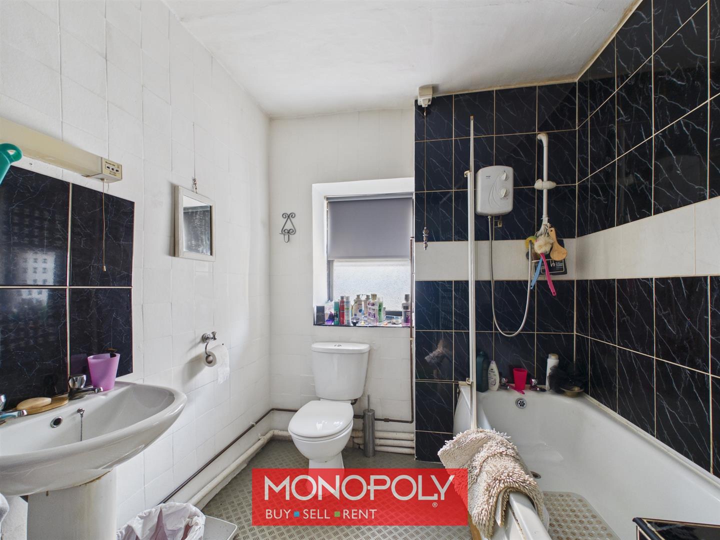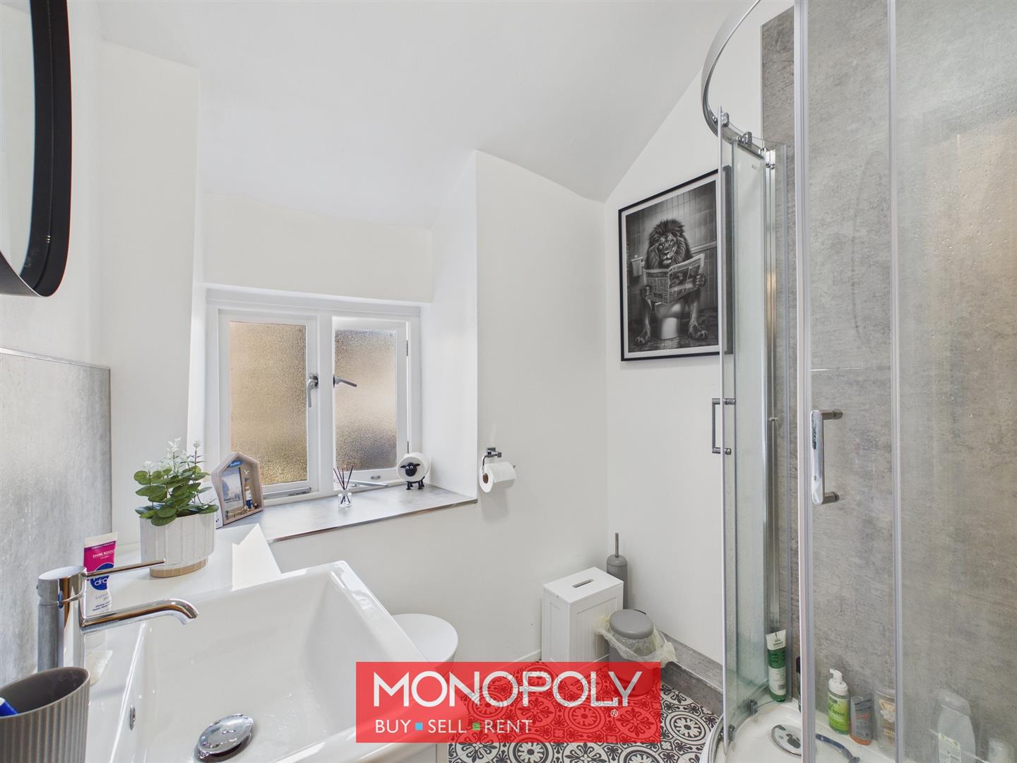 Fitted with a three-piece suite, the bathroom comprises a corner shower enclosure with thermostatic shower, WC unit and vanity unit with inset sink. A privacy window with deep sill provides natural light, while laminate splashbacks, decorative vinyl flooring and a radiator complete this practical and well-presented space.