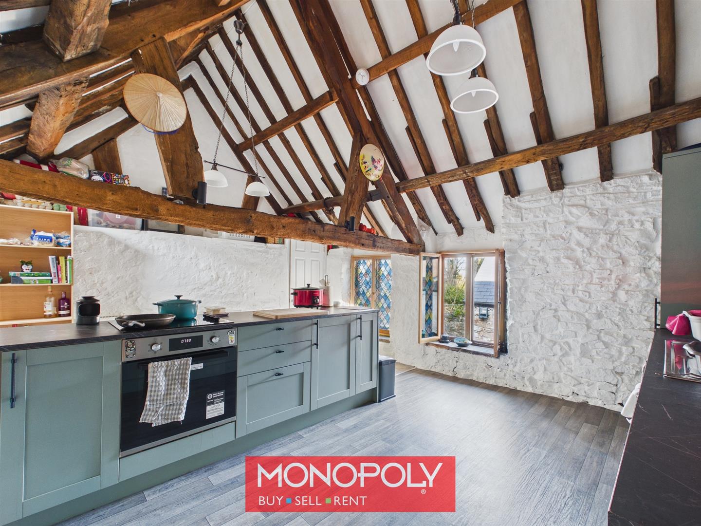 The main living area is a remarkable open-plan space with dramatic exposed beams, whitewashed walls and an abundance of original architectural detail that gives the room a warm and inviting feel. Offering excellent floor space for seating and relaxation, this highly individual room provides a superb central hub to the home.