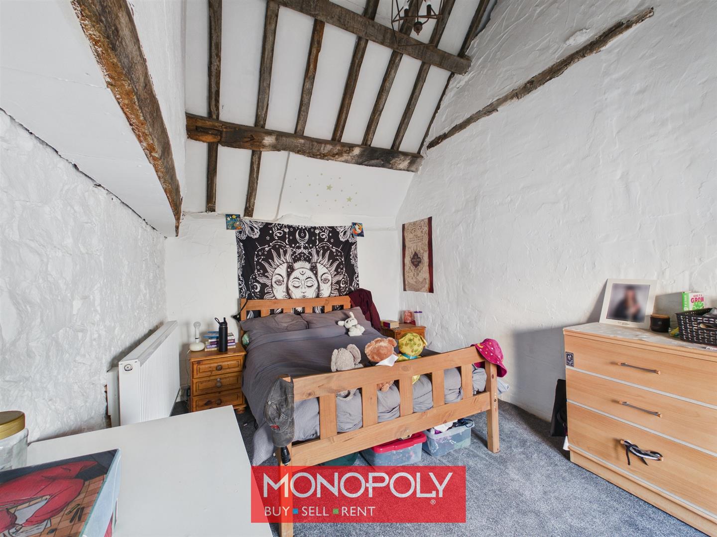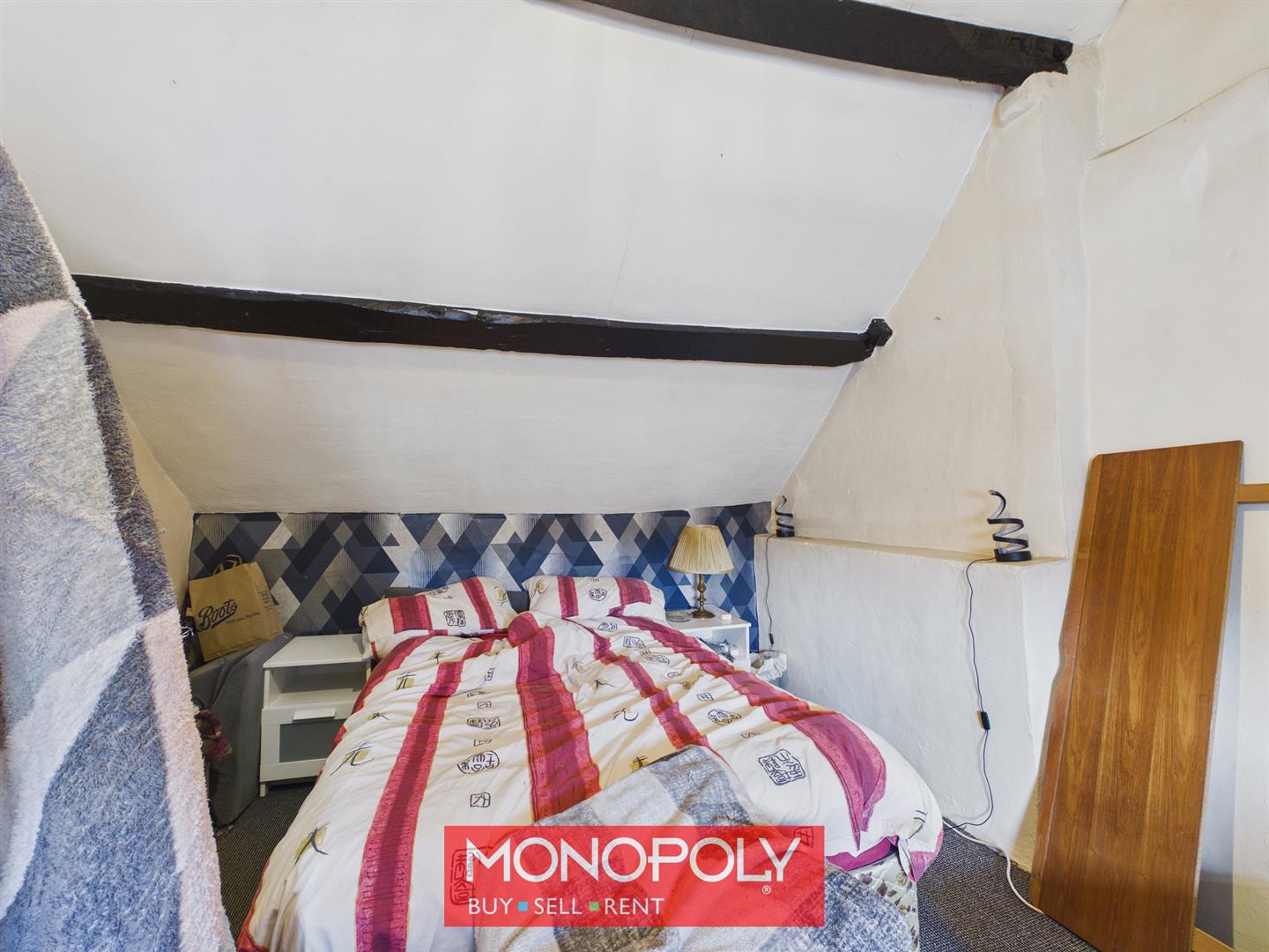The second bedroom is another well-sized double room with a more traditional layout, featuring exposed ceiling beams, carpeted flooring and a window providing natural light. The room offers good space for bedroom furniture and would serve equally well as a guest room, principal bedroom or additional living space if required.