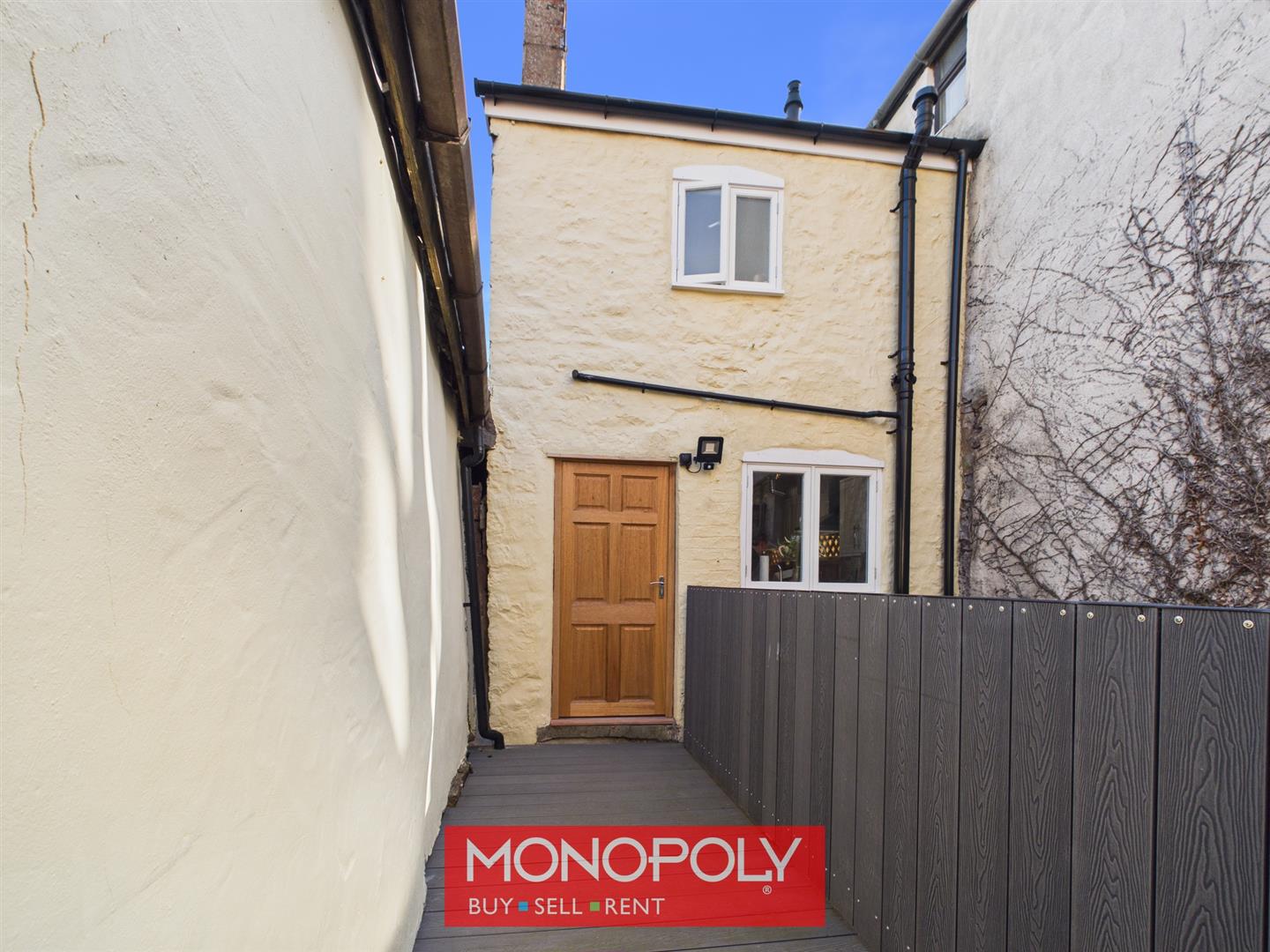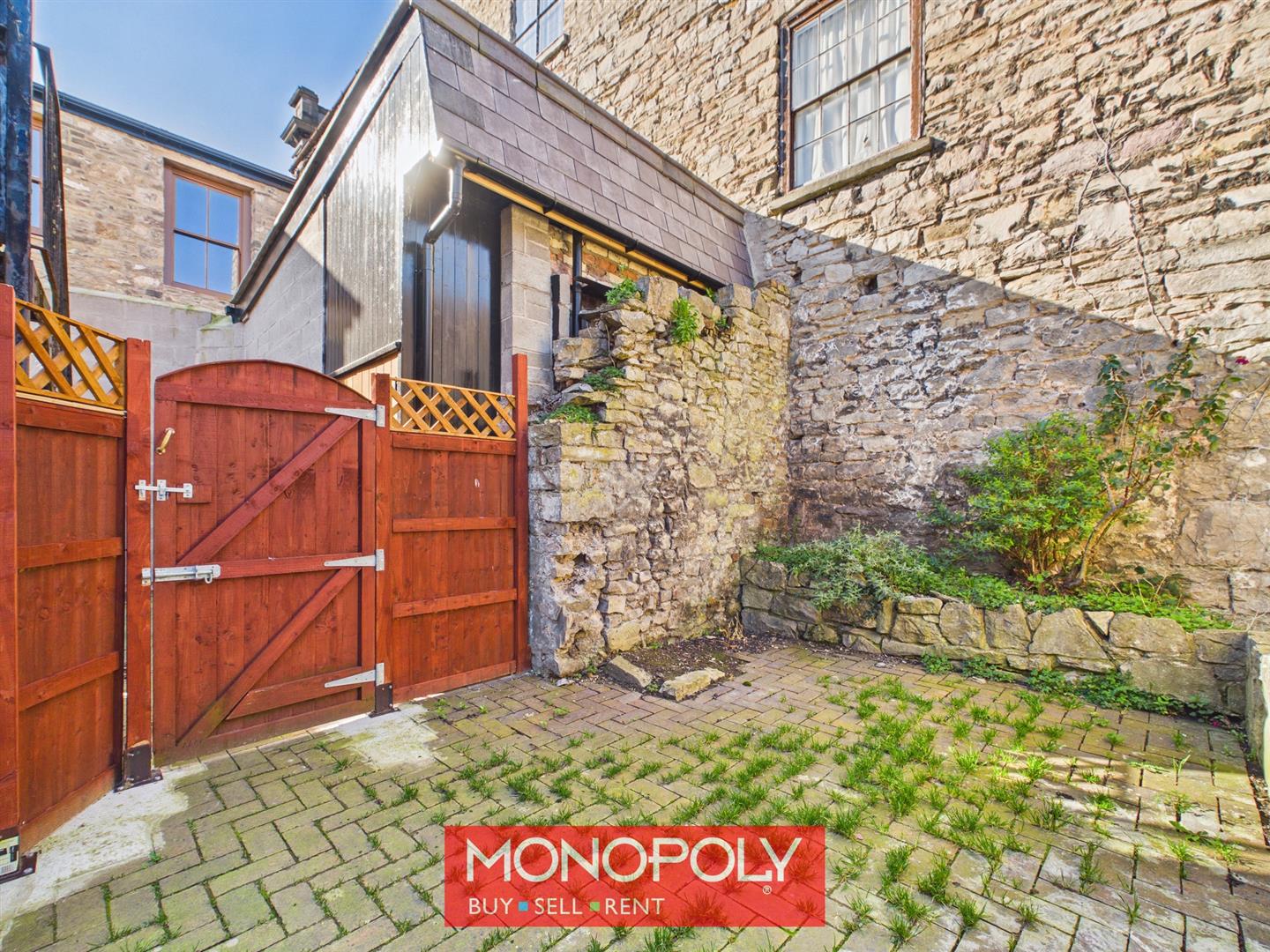 A gated access opens into this enclosed and low-maintenance courtyard with paved flooring, raised borders, stone walls, and a composite walkway leads to the front door.