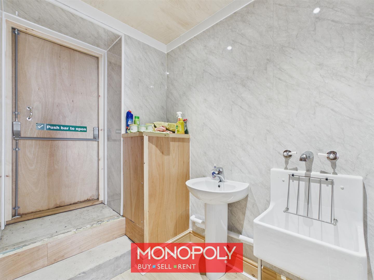 The shower room is fitted with laminate wood-effect flooring, two sinks and PVC wall cladding for easy maintenance. There is a separate door to the WC, a shower enclosure with electric shower, and steps leading to a fire door and out to the yard.