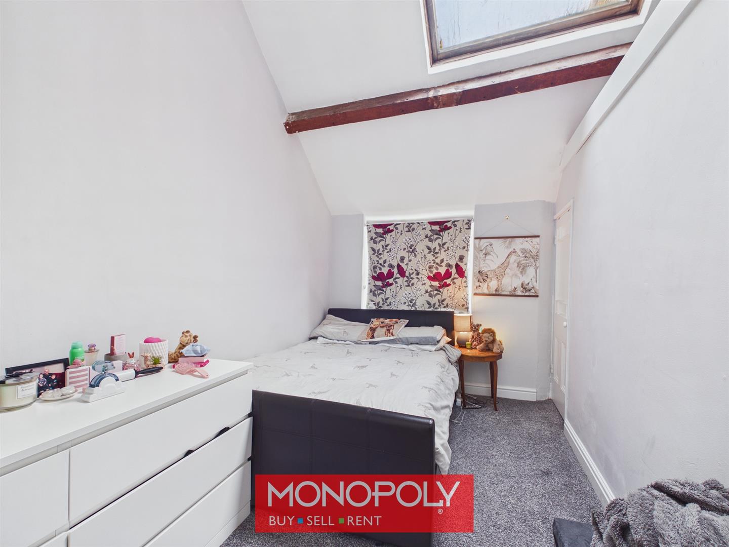 A characterful double bedroom featuring a carpeted floor, exposed beams and an attractive apex roof that adds height and charm to the room. A skylight and additional window allow for plenty of natural light, while a radiator provides comfort. The room also benefits from a useful storage cupboard, together with generous storage space above.