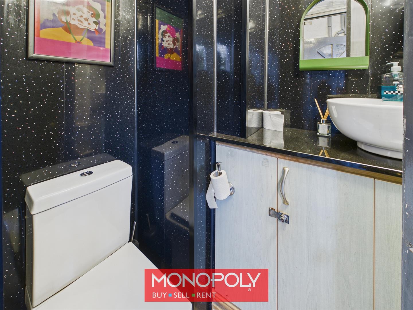 The WC is fitted with a low-flush toilet and a vanity unit with granite-style top, complemented by PVC wall cladding, tiled flooring and lighting.