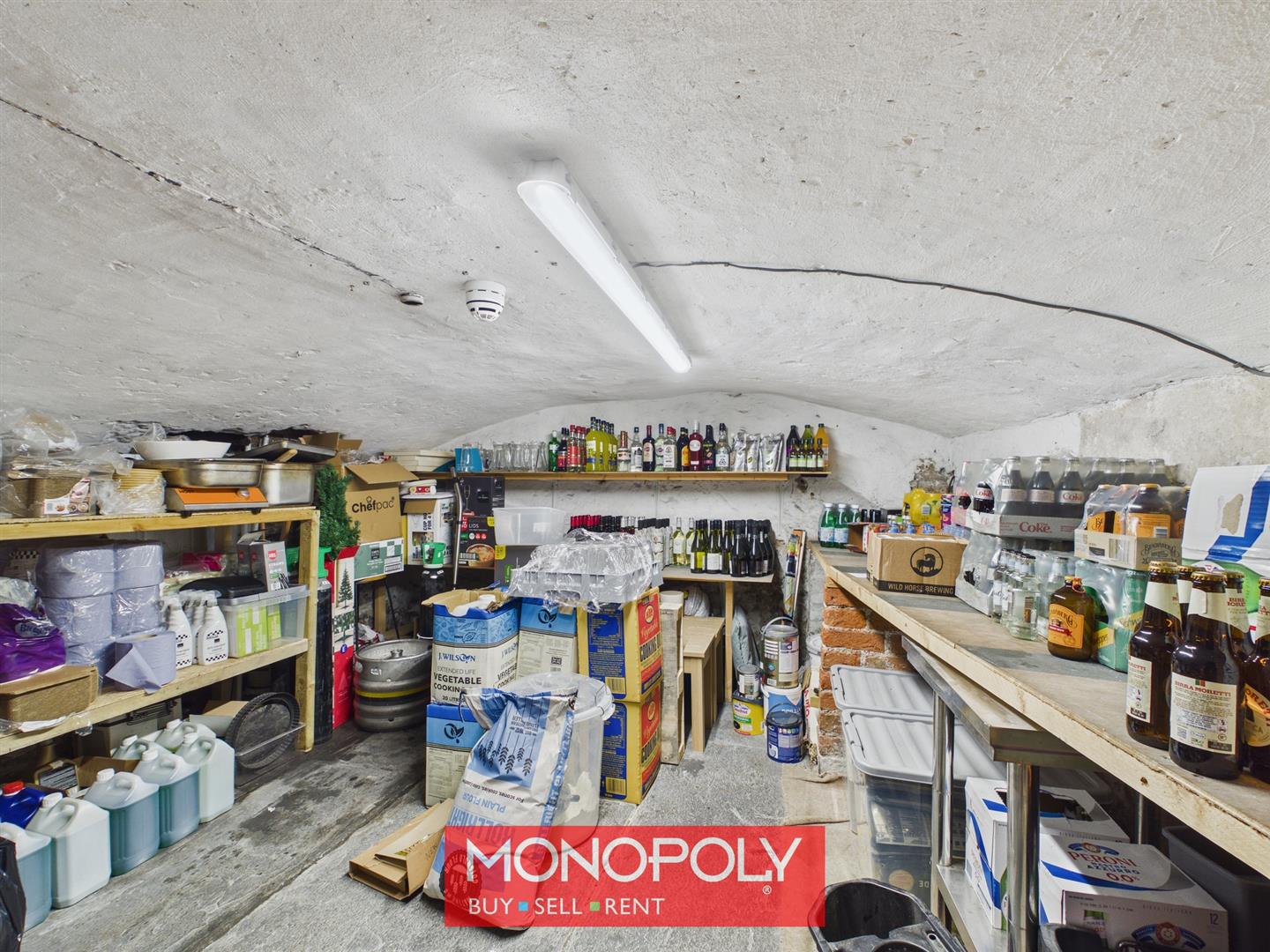 A useful cellar space with stone flooring, stone and slate steps, and an arched ceiling, currently used as a pantry. The room is fitted with lighting and offers excellent storage potential.