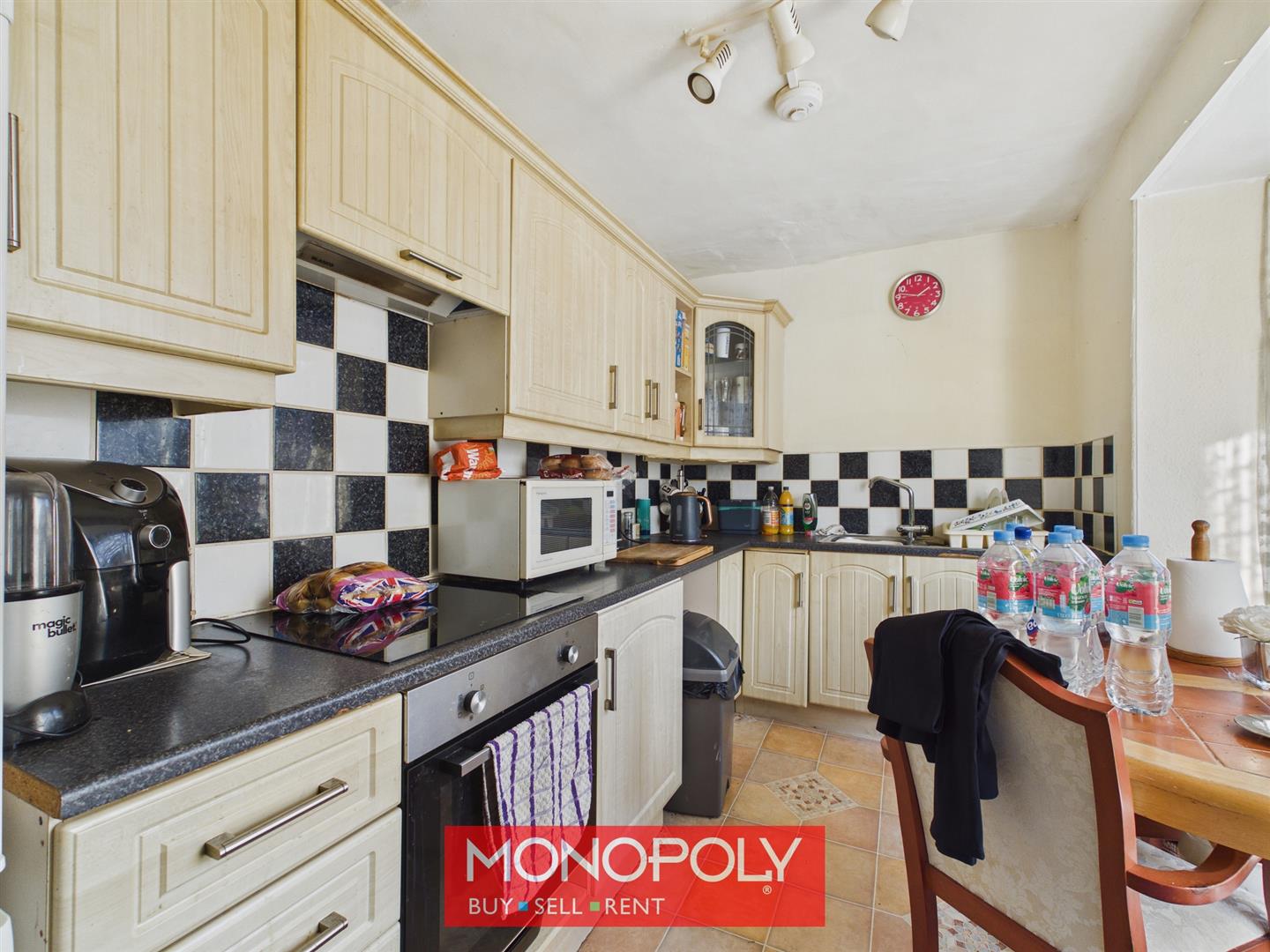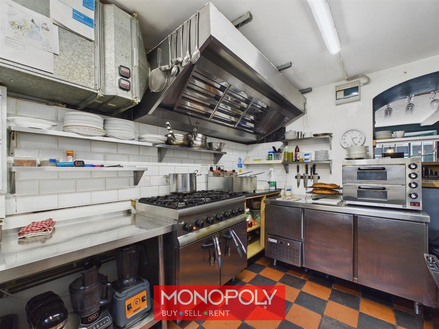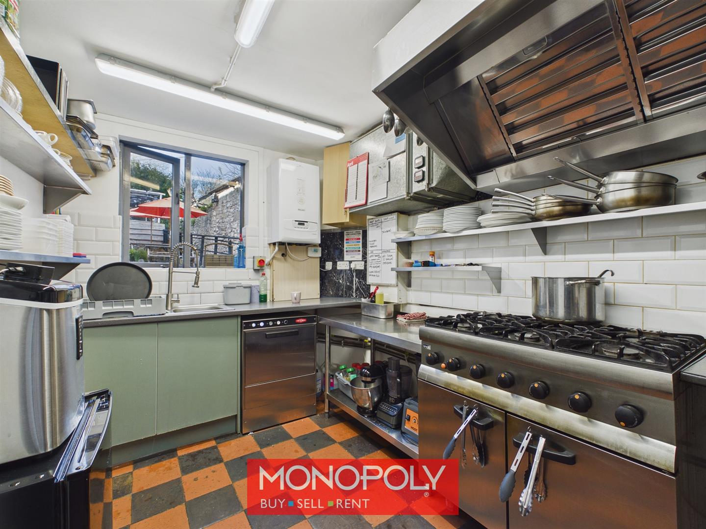 Located to the rear, the kitchen is fitted with black and red tiled finishes and has a rear-facing window. An opening connects the space to the main shop area, allowing for easy access and functionality.