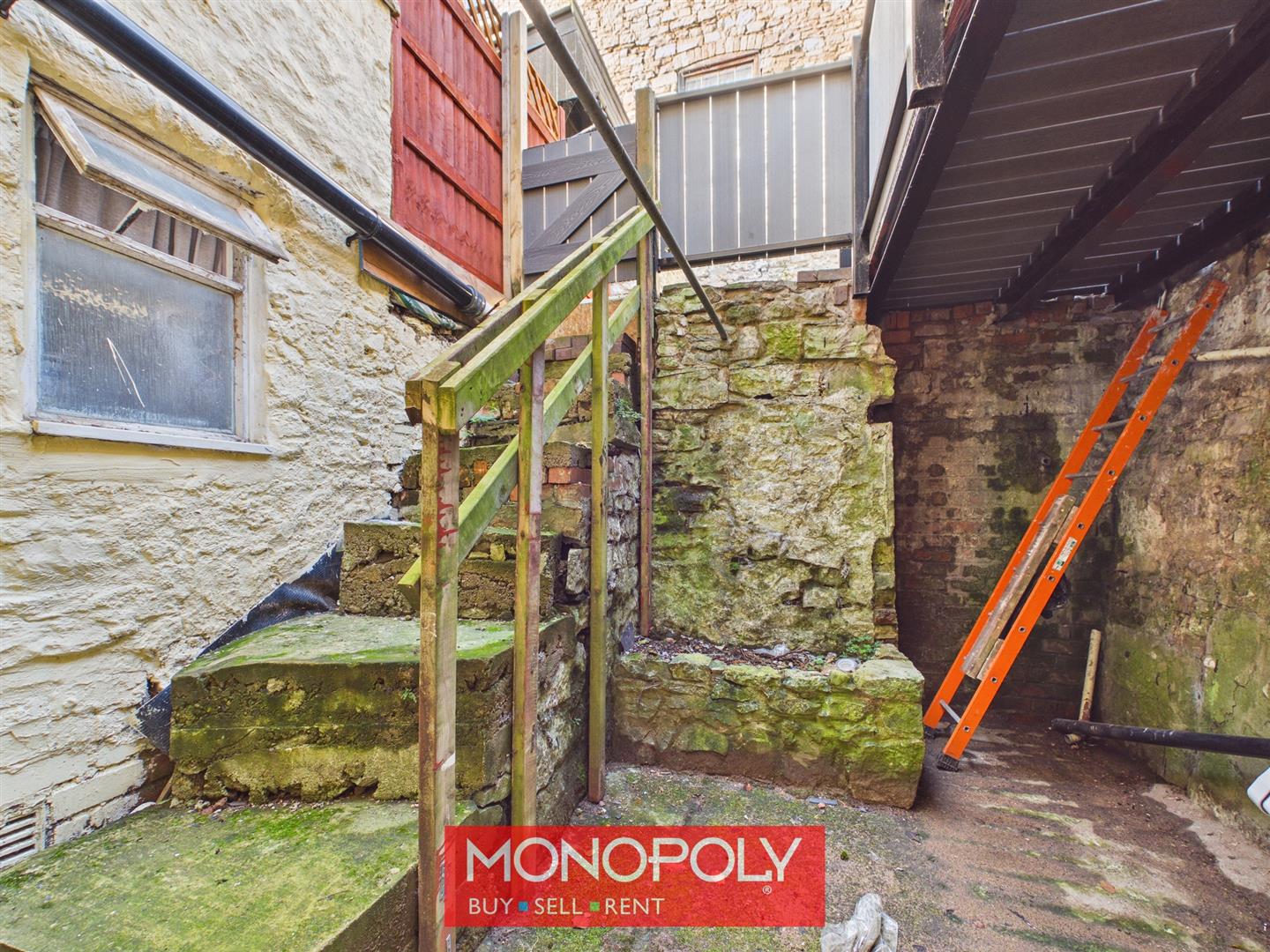 Outside, there is an enclosed yard area with steps leading up, providing a practical external space.