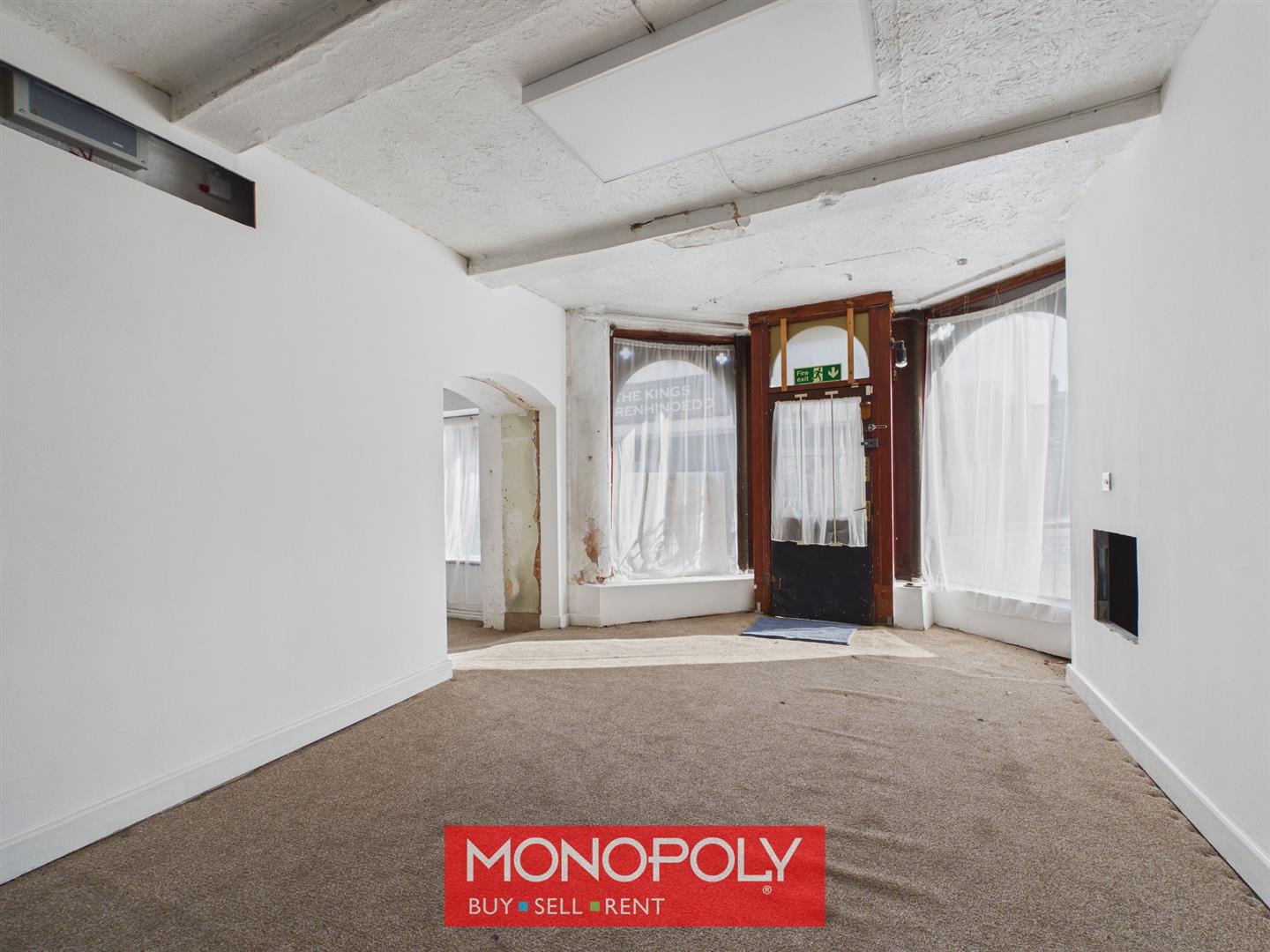 A spacious main room with a carpeted floor and large wooden-framed windows and doors that allow in plenty of natural light. An archway opens through to the showroom, while a door to the rear provides access to the shower room and outdoor yard.