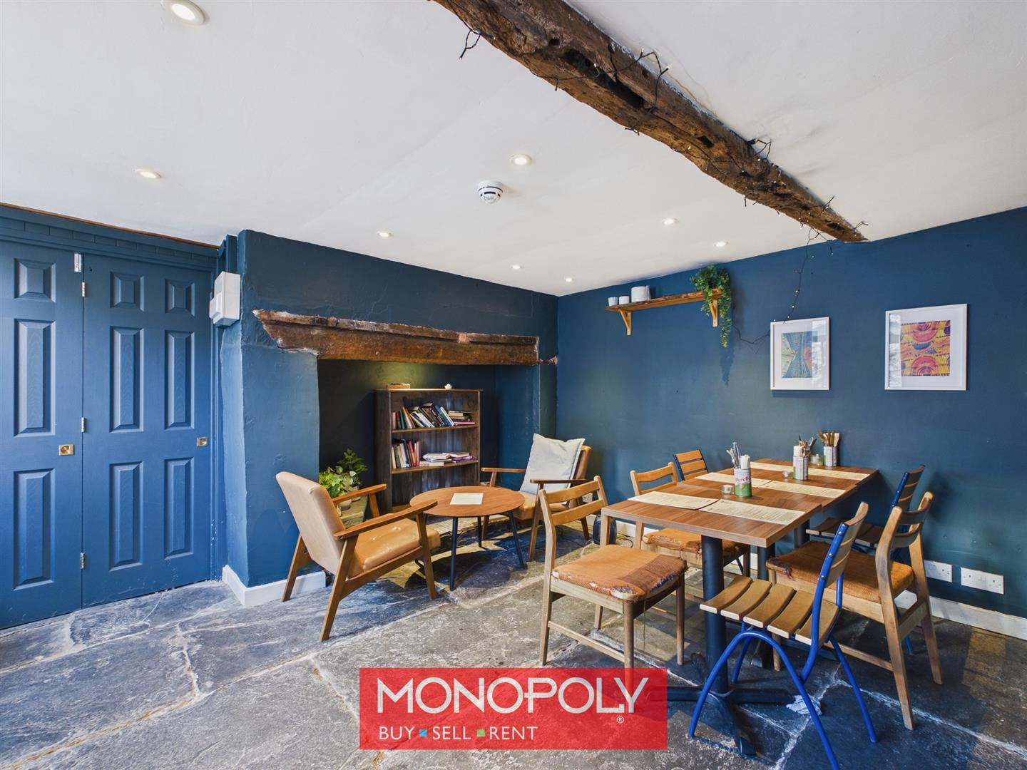 The first room is a characterful and inviting dining area, full of charm and period appeal, featuring exposed ceiling beams, a striking inglenook-style recess with timber lintel, deep-toned décor and flagstone flooring, ideal for relaxed dining or entertaining.
