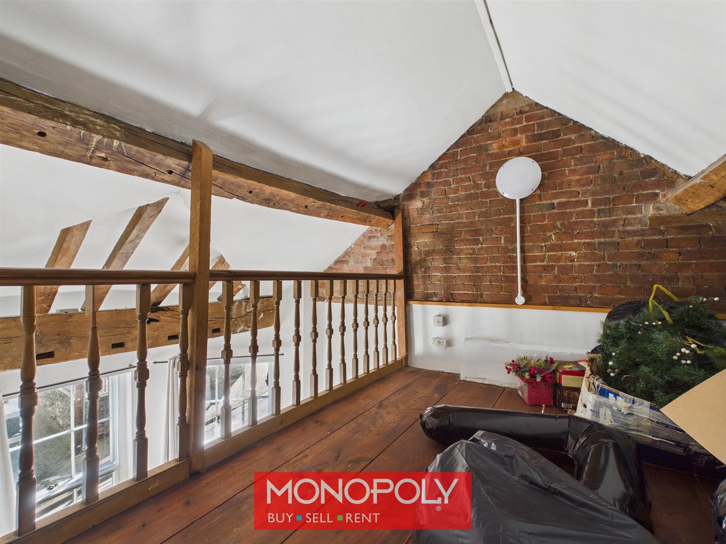 A characterful mezzanine room featuring exposed brickwork, original beams, vaulted ceiling and wooden flooring, creating a unique and charming space. Overlooking the lounge below, this unique area offers a versatile use while beautifully showcasing the property’s historic charm.