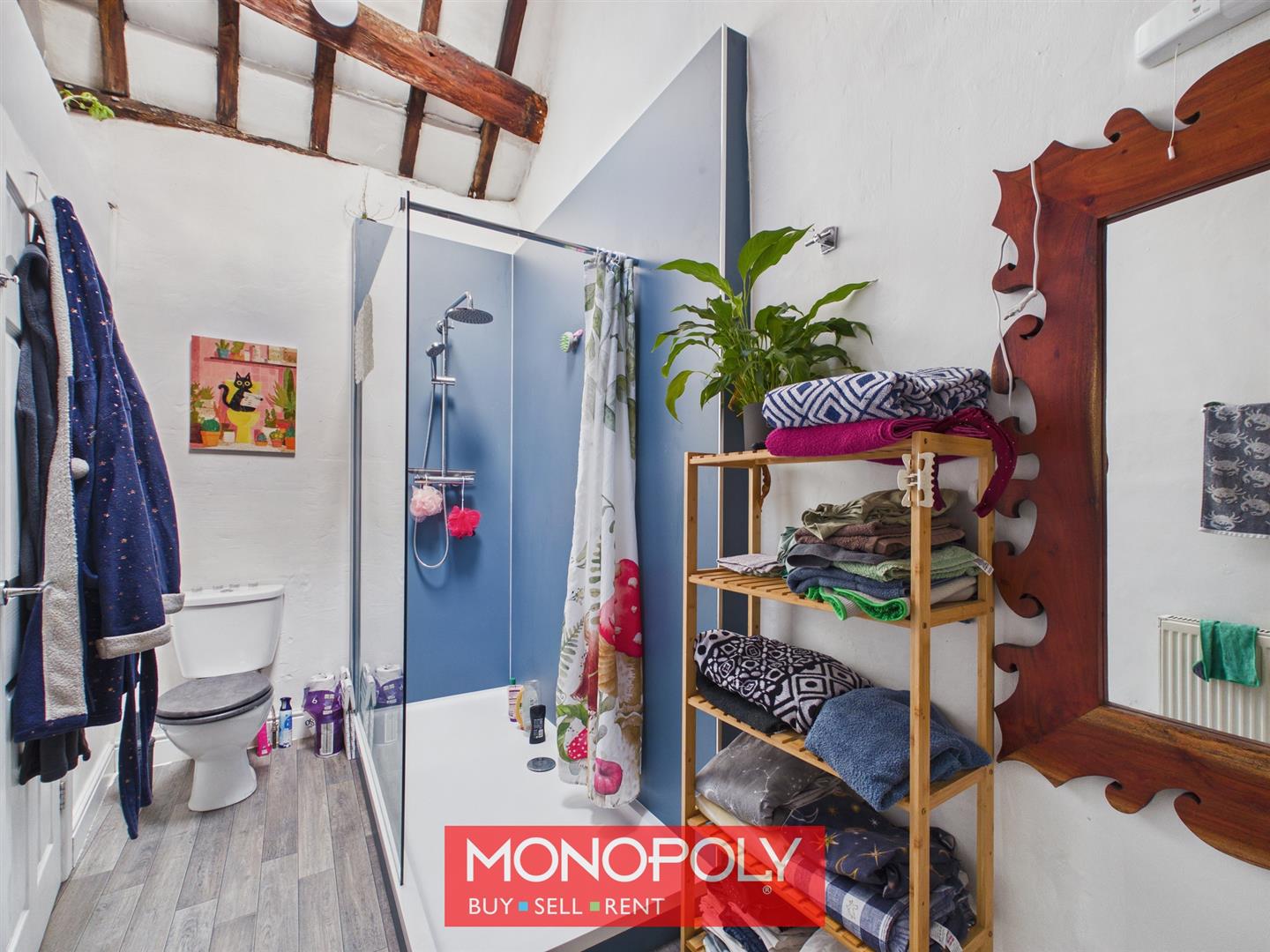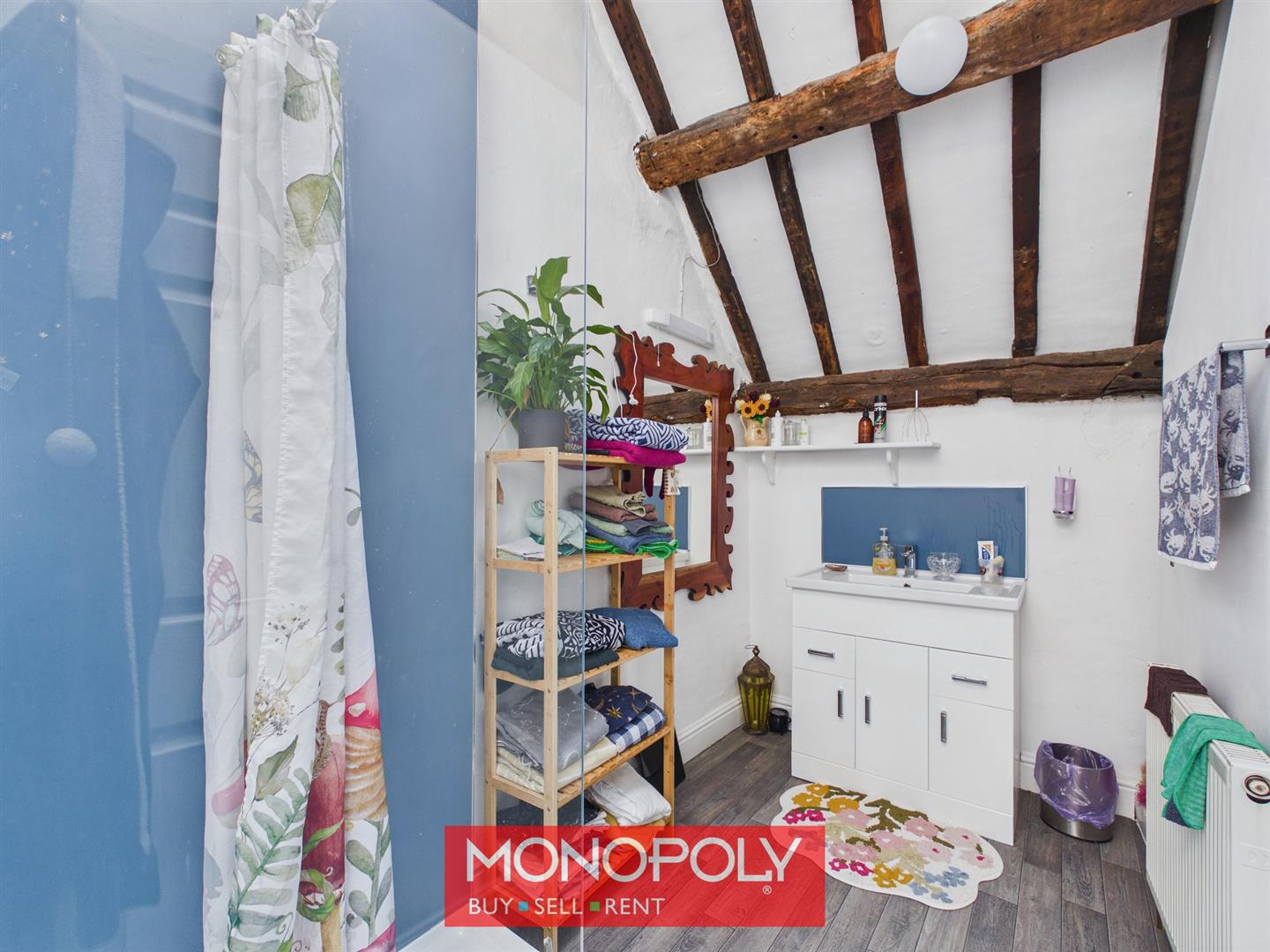 A generous and stylish room fitted with a modern white suite including a walk-in shower, vanity wash basin and WC. Finished with attractive flooring and complemented by exposed ceiling timbers, it provides a fresh and practical space in keeping with the property’s character.