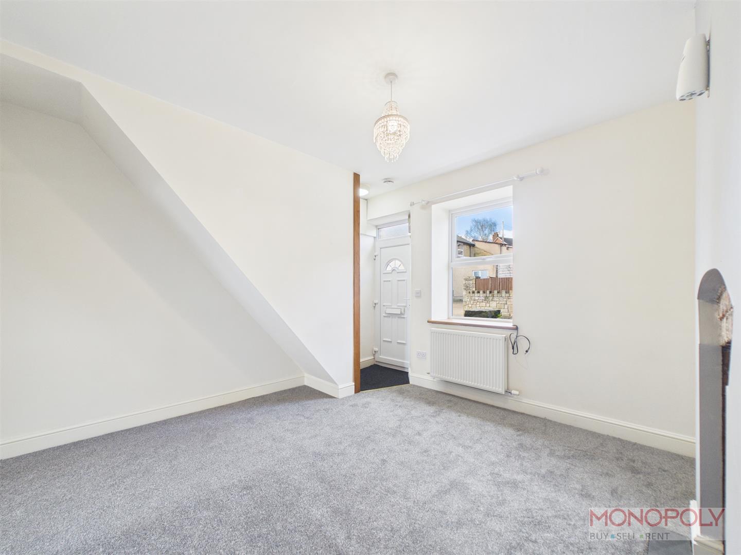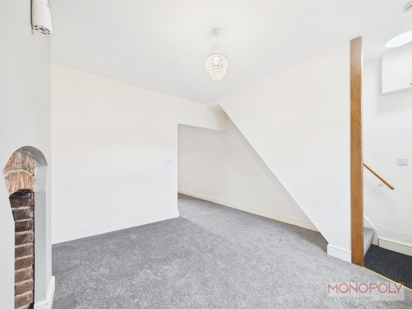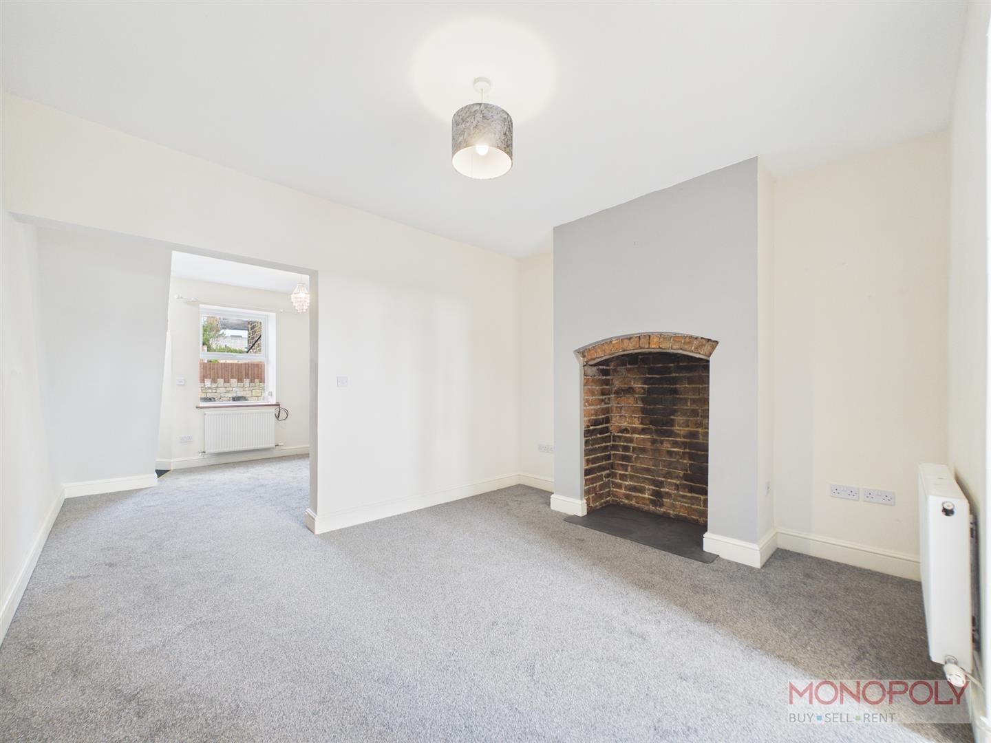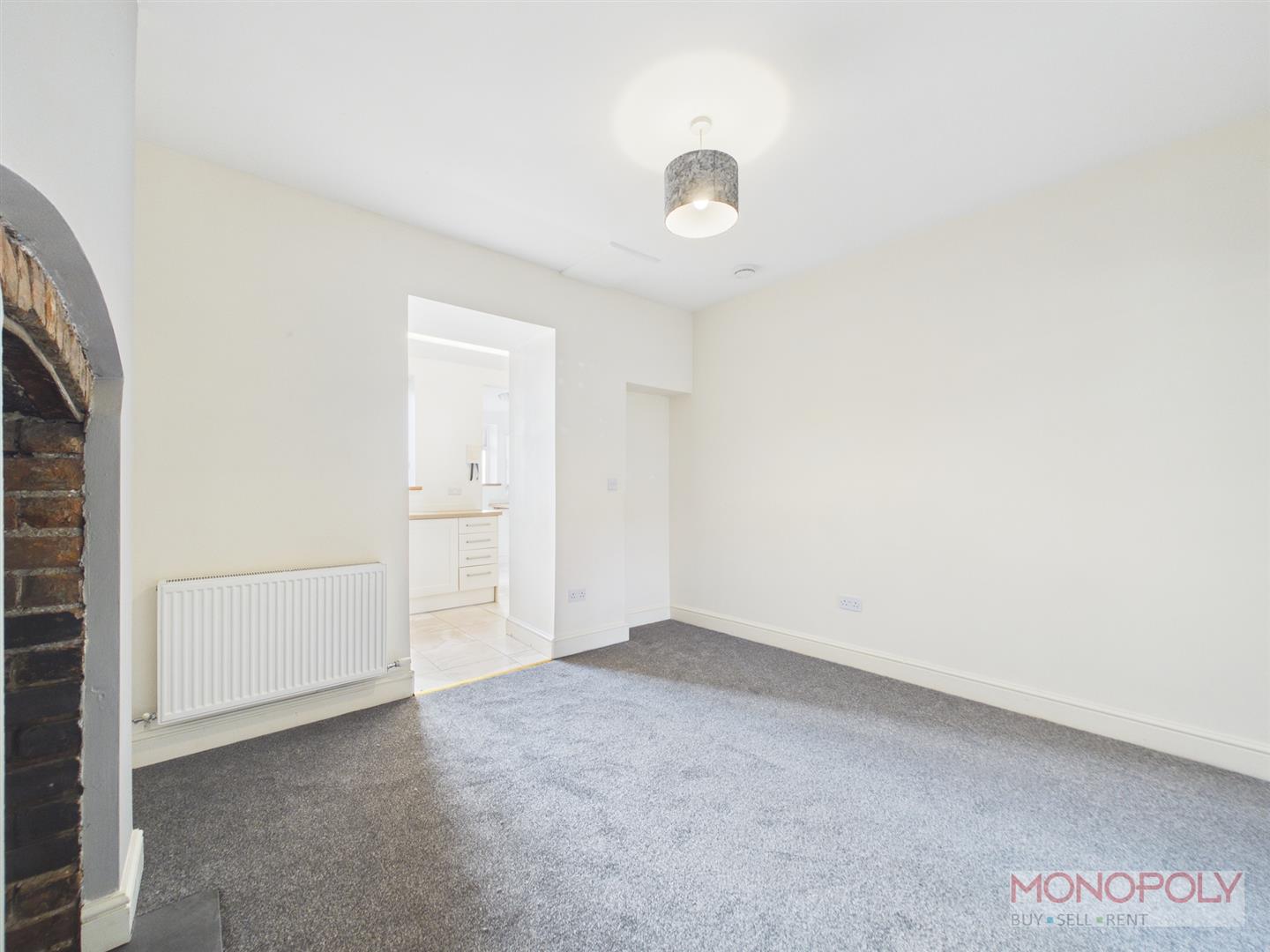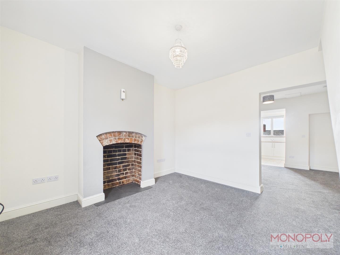 UPVC double glazed window to the front elevation, ceiling light points, radiator, carpeted flooring and fireplace alcove with brick surround and slate hearth. Opening into dining room.
