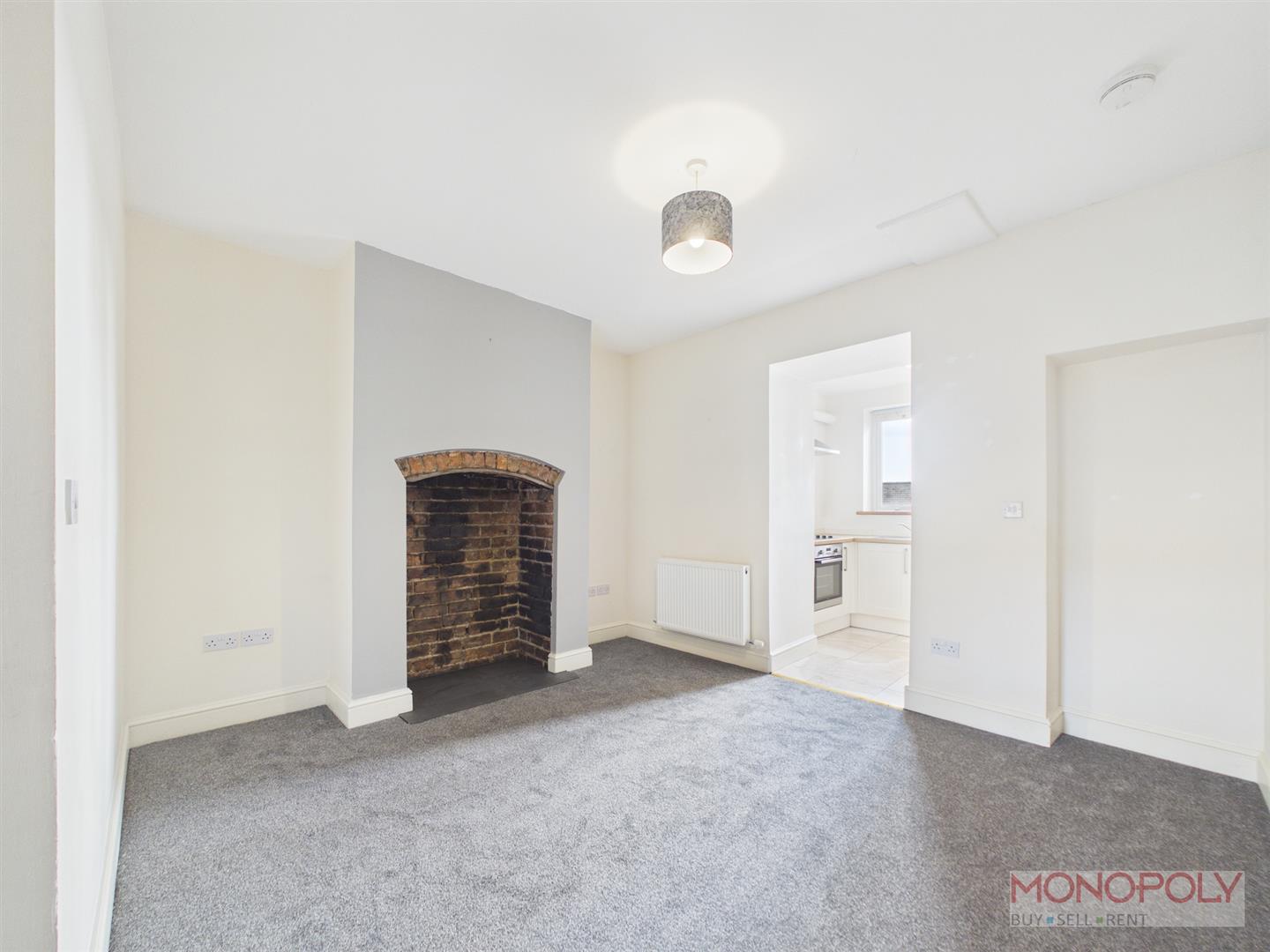 Carpeted flooring, ceiling light point, radiator, fireplace alcove with brick surround and slate hearth and opening into the kitchen.