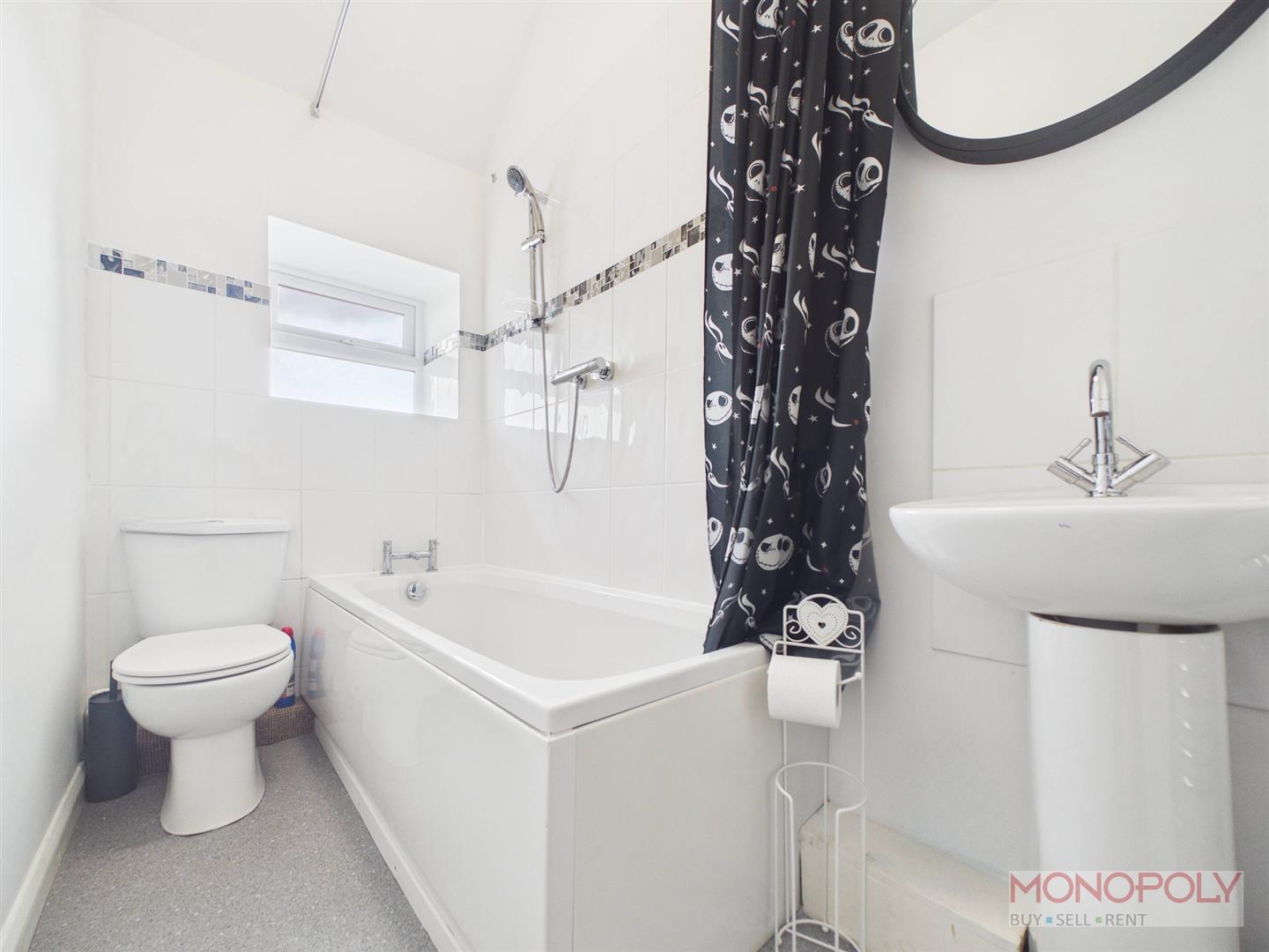 A three-piece suite comprising a low-level W.C., pedestal hand wash basin and panelled bath with shower over. Shaving points, chrome heated towel rail, part tiled walls, extractor fan and uPVC double glazed window to the rear elevation.