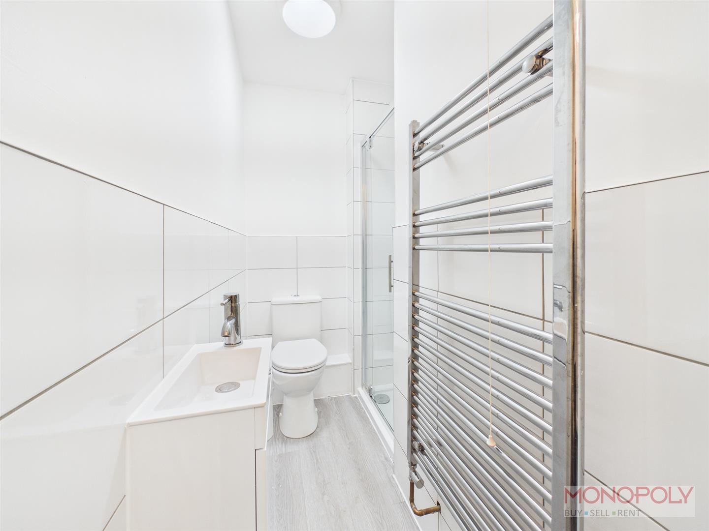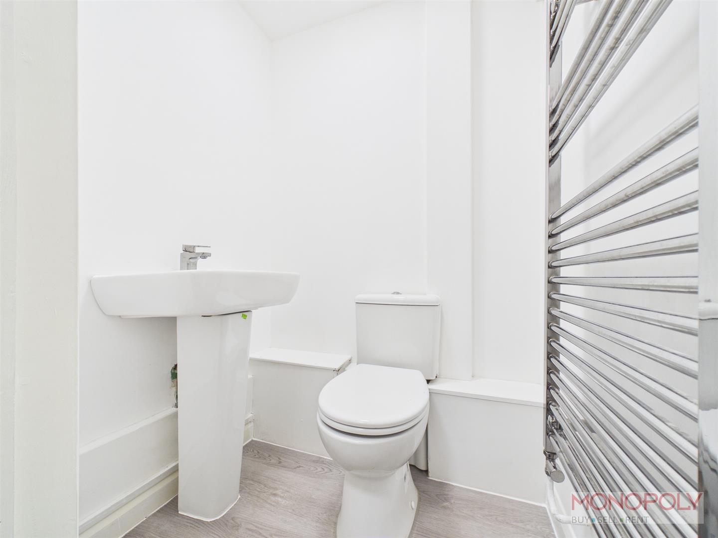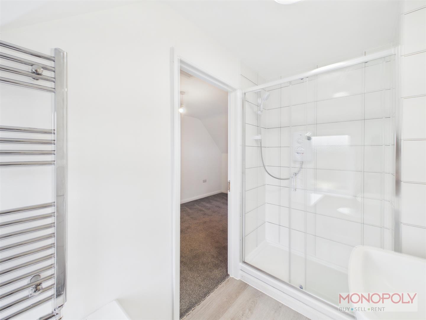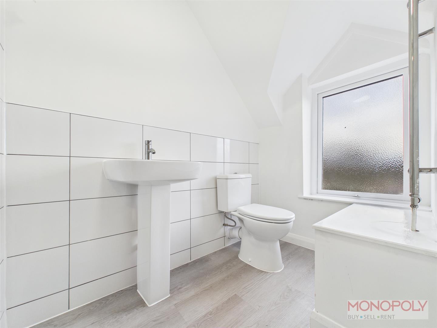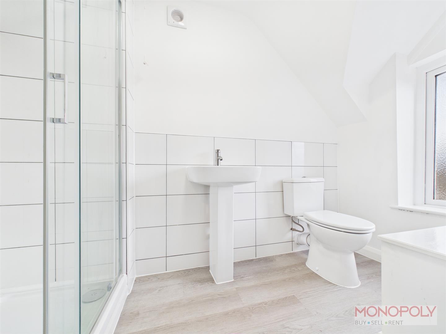 A three-piece suite comprising a low-level W.C., pedestal hand wash basin with mixer tap over and double size walk-in shower cubicle with electric shower over. Part tiled walls, wood effect flooring, heated towel rail, ceiling light point, extractor fan and uPVC double glazed window to the rear elevation.