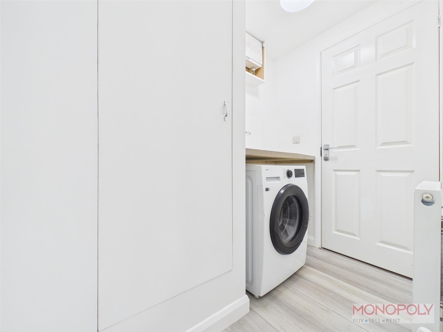 A useful utility with space and plumbing for a washing machine, wall units, worktop, ceiling light point, radiator and door into storage cupboard.