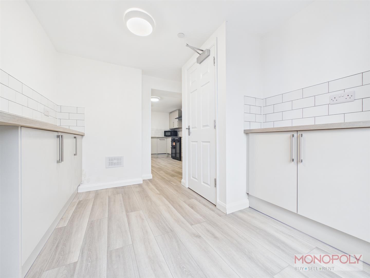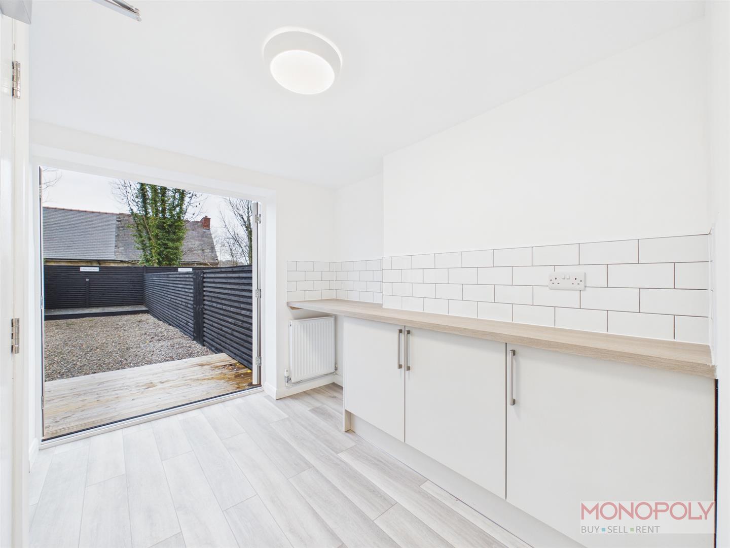 A useful room housing base units with complimentary worktop over, part tiled walls, ceiling light point, wood effect flooring and radiator. French doors opening onto the rear garden and opening into the kitchen.