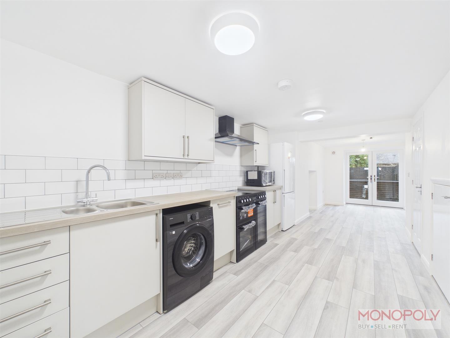 Stairs down from the lounge to the kitchen which is beautifully appointed with brand new fitted wall, drawer and base units, wood effect work surfaces with inset 1 1/4 sink and drainer, brand new 'beko' range style cooker with electric double oven, 5 ring electric hob, extractor fan, integrated dishwasher, part tiled walls, wood effect flooring, space for a dryer and plumbing for a washing machine, double glazed french doors off to the rear garden, door to an under stairs storage cupboard, door to the downstairs w.c.