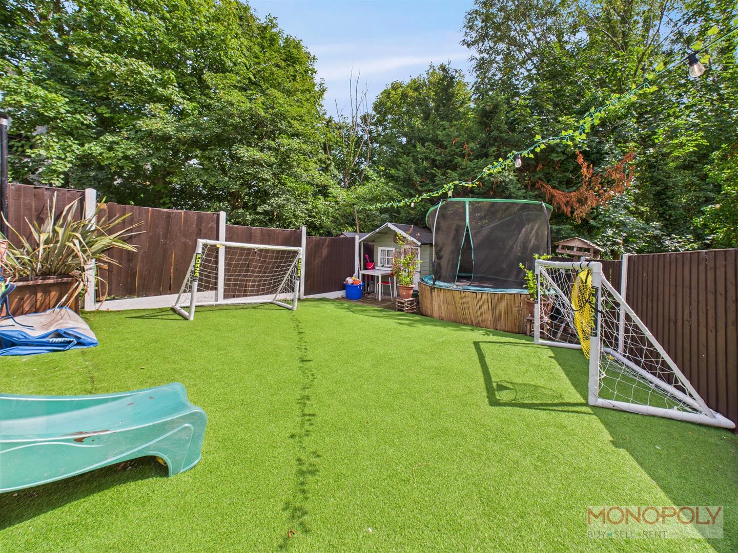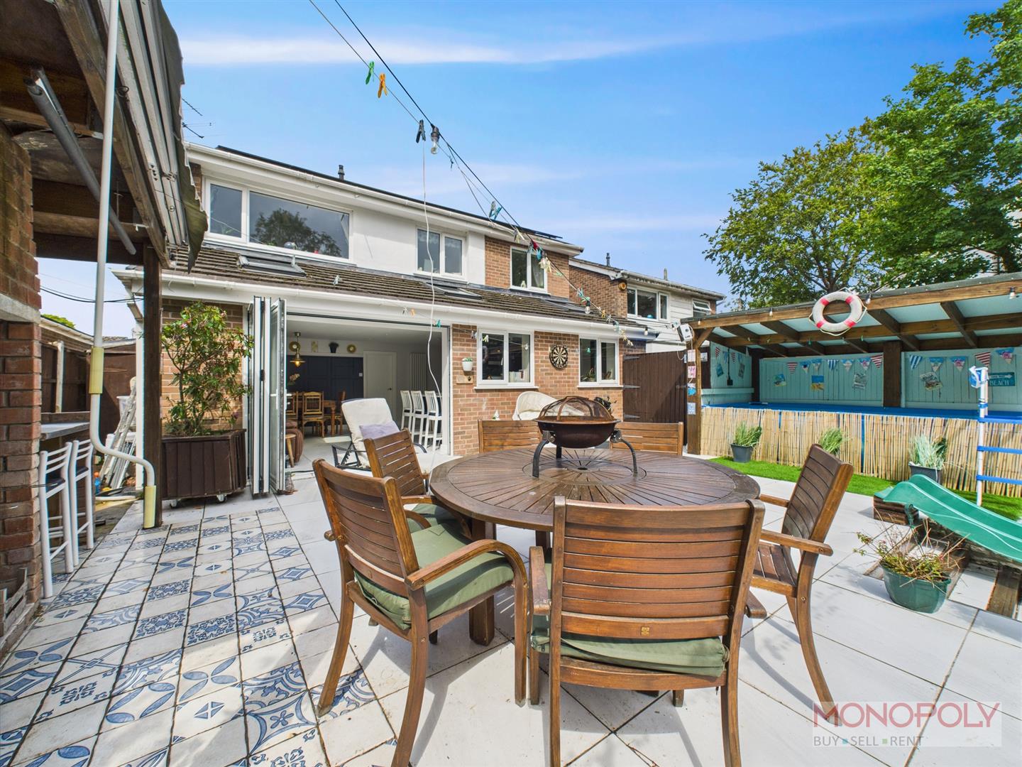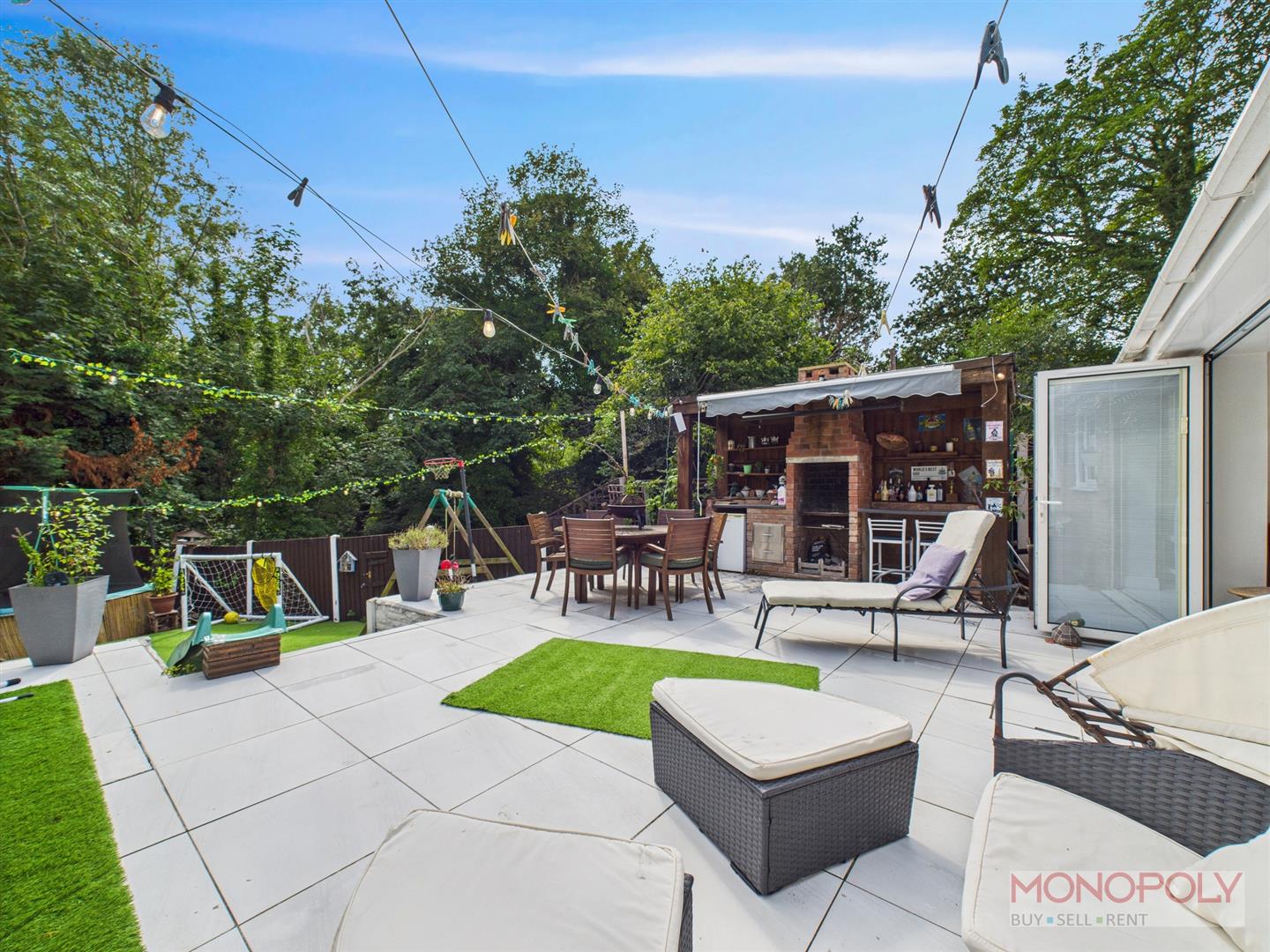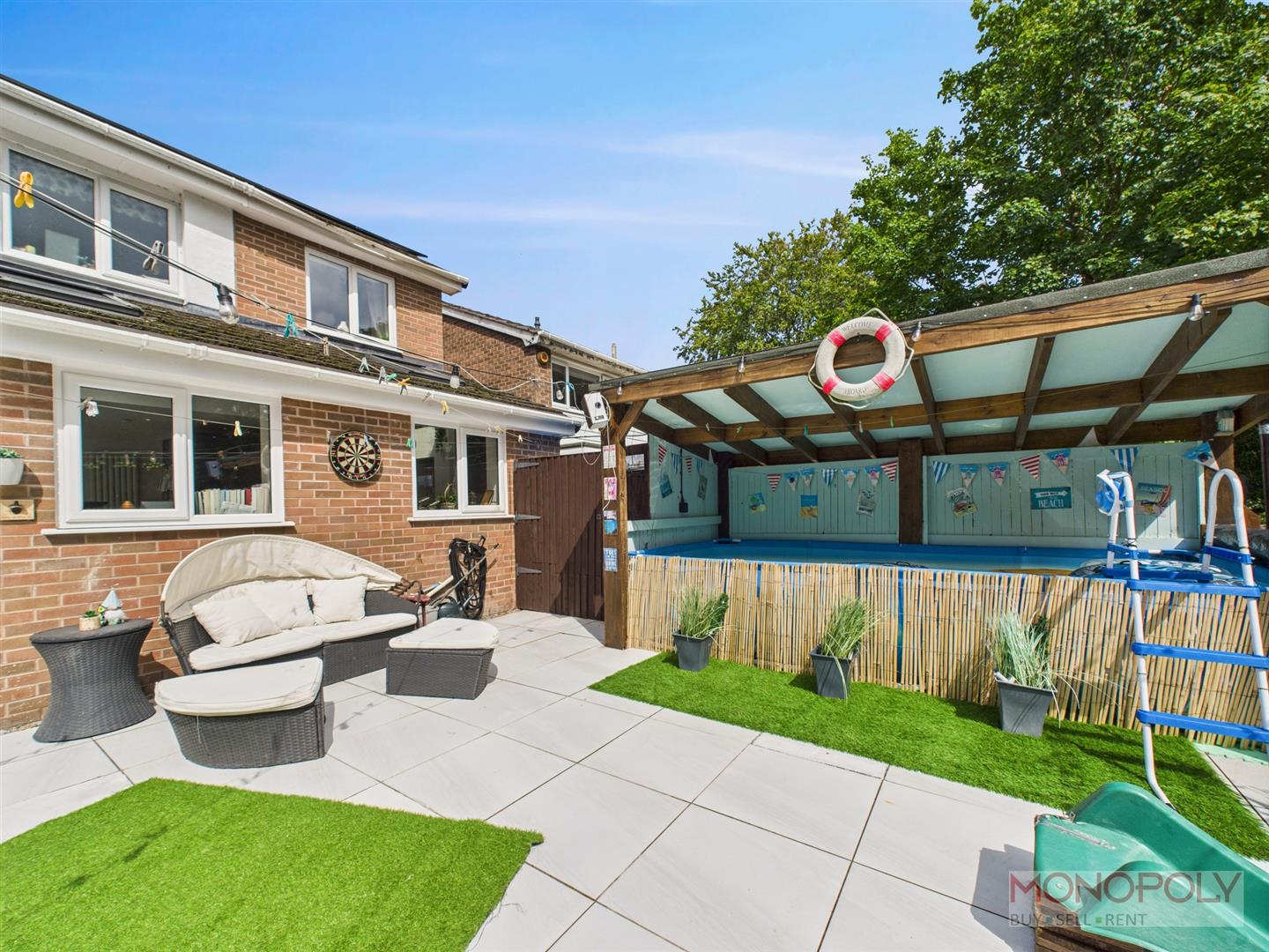This fantastic garden consists of housing for a heated pool (pool not included) with sheltered pergola and a well-equipped barbeque. Steps lead down to a generous artificial lawn, allowing for easy maintenance of a fabulous family area. Mature trees provide a great sense of privacy. Multiple seating areas, including the patio area accessed from the bi-fold doors, provide a perfect setting for entertaining or relaxation. The garden is also finished considering practicality with lighting, power sockets and an hot and cold outdoor tap. To the front, the block paved driveway provides off-road parking for two to three vehicles. Artificial lawn, established shrubberies, rear access via side.