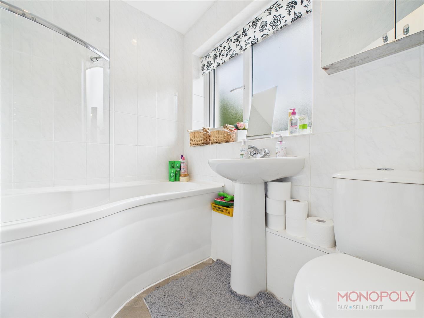 Modern three piece suite comprising wash hand basin with vanity unit, corner mains shower cubicle and low-level WC. PVC splash back walls, heated towel rail, extractor, frosted window to side, tiled flooring and ceiling light point.
