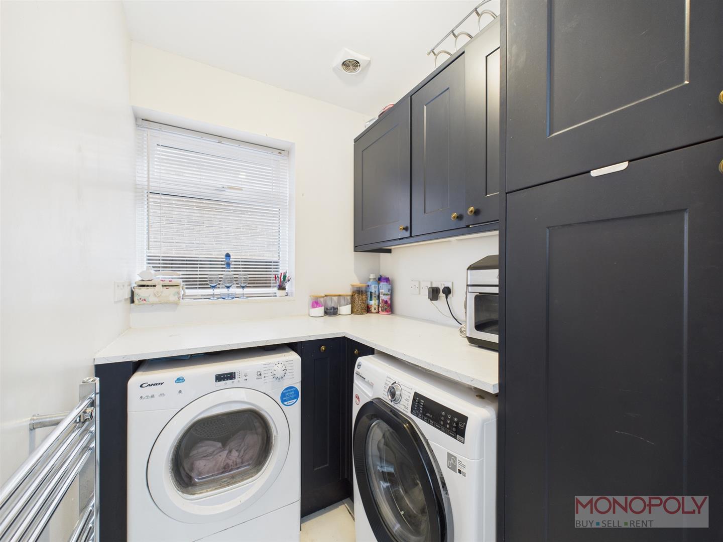 Houses a range of base and wall units with quartz work surface over. Space and plumbing for washing machine and dryer. Finished with heated towel rail, extractor fan, ceiling light point, uPVC double glazed window to side and a continuation of Italian porcelain tiled floor.