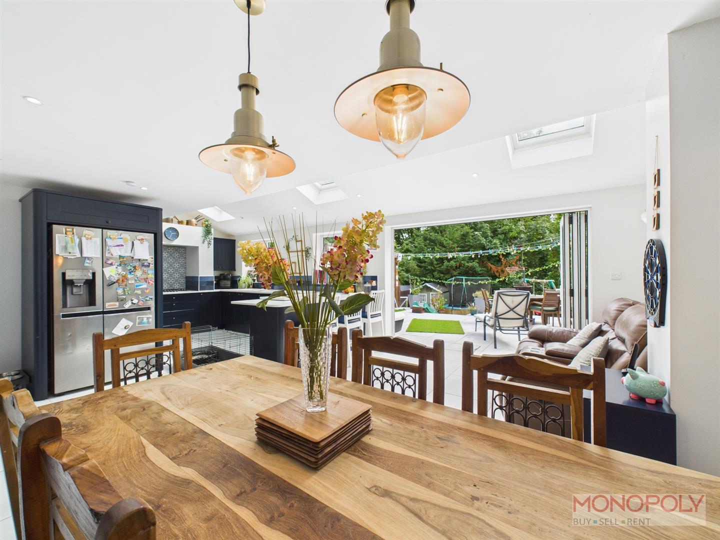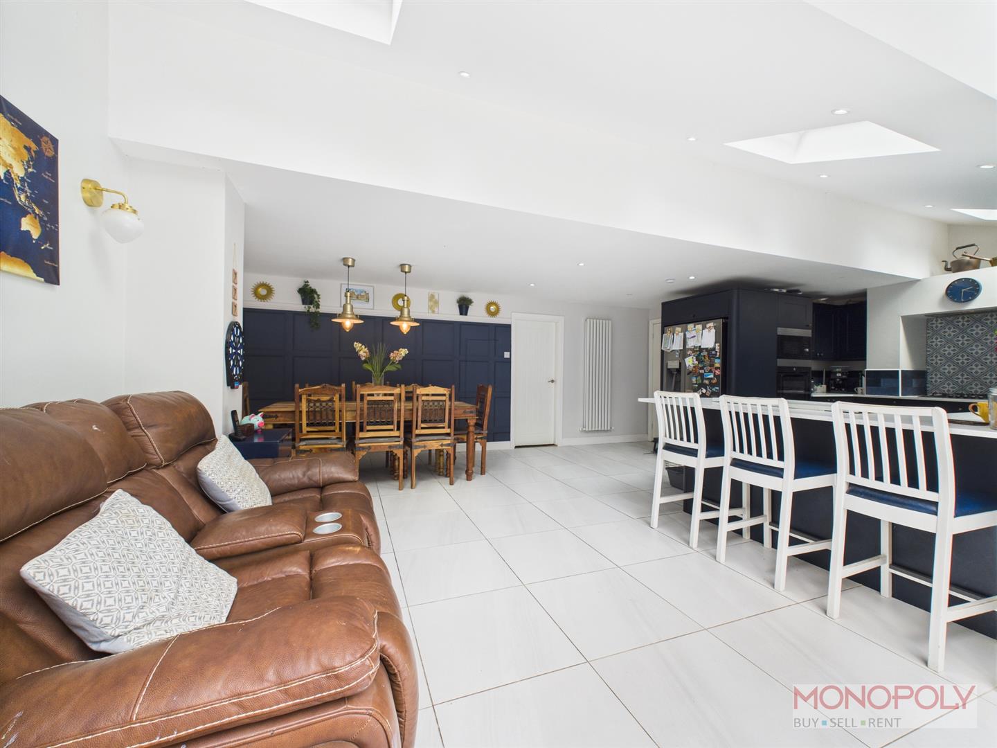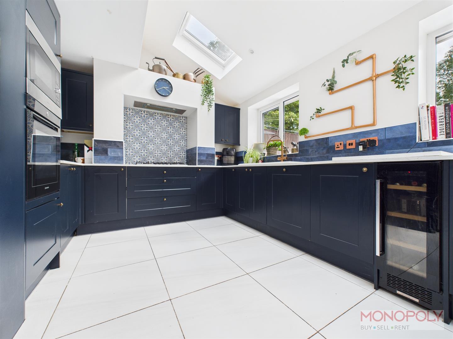 This beautifully designed kitchen houses a range of wall, draw and base units finished with complimentary work surface over finished with splash back tiling. Integrated appliances include oven which allows a smart system to control settings and monitor cooking, microwave and dishwasher. Five ring gas ring hob with fitted extractor above. 1.5 porcelain sink unit with brushed copper mixer tap featuring an instant hot water boiling system. This impressive kitchen also features a breakfast bar with seating, Italian porcelain tiles which extends to patio area. two radiators with one being vertical, hidden storage cupboard with shelving and doors, three Velux sky lights, UPVC double glazed window to rear and uPVC bi-fold doors, creating a seamless indoor-outdoor living experience. There is space for a separate dining table and sofa making this a modern and versatile space.