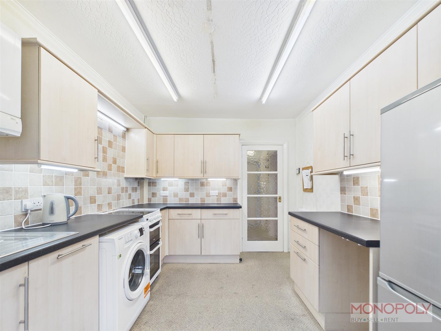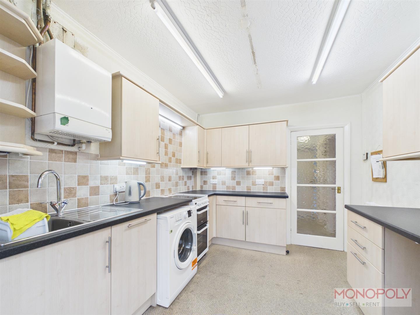 Fitted with matching wall, drawer and base units, working surface with inset stainless steel sink and drainer, space for a cooker, integrated dishwasher, washing machine and fridge/freezer, part tiled walls, double glazed door into the garden room, wall mounted gas boiler.