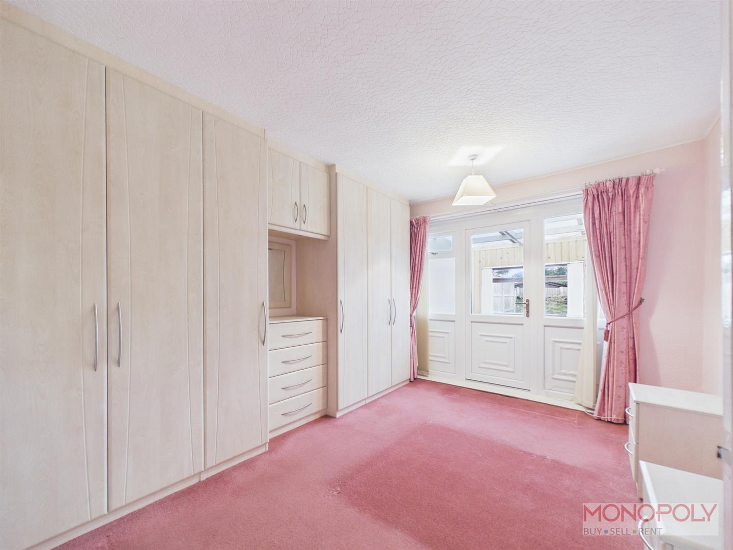 A spacious bedroom with fitted wardrobes and drawers, carpeted flooring, double glazed door into the garden room.