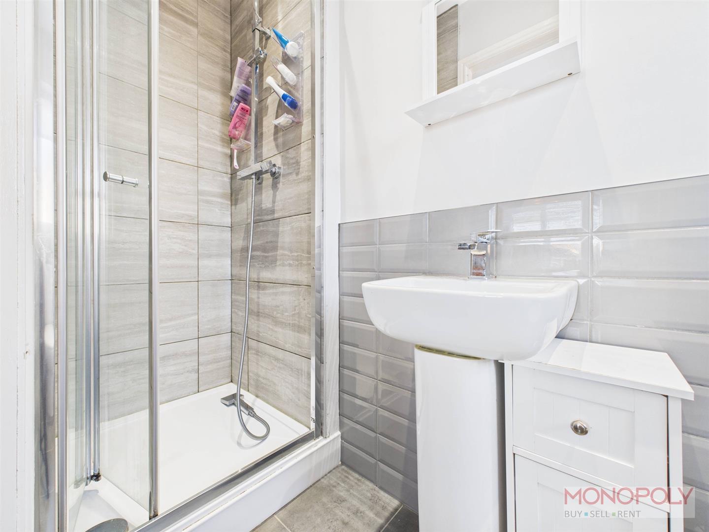 Three piece suite comprising low-level WC, pedestal wash hand basin and dual hose mains shower cubical. Shave point, tiled floor, heated towel rail, recessed LED, extractor and uPVC double glazed frosted window to the side.