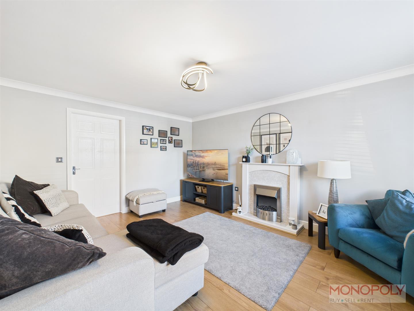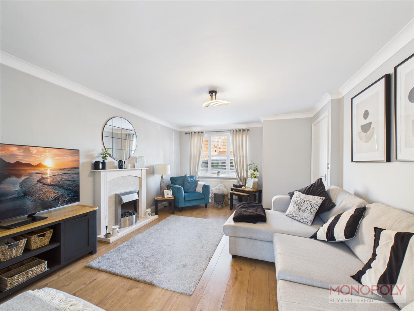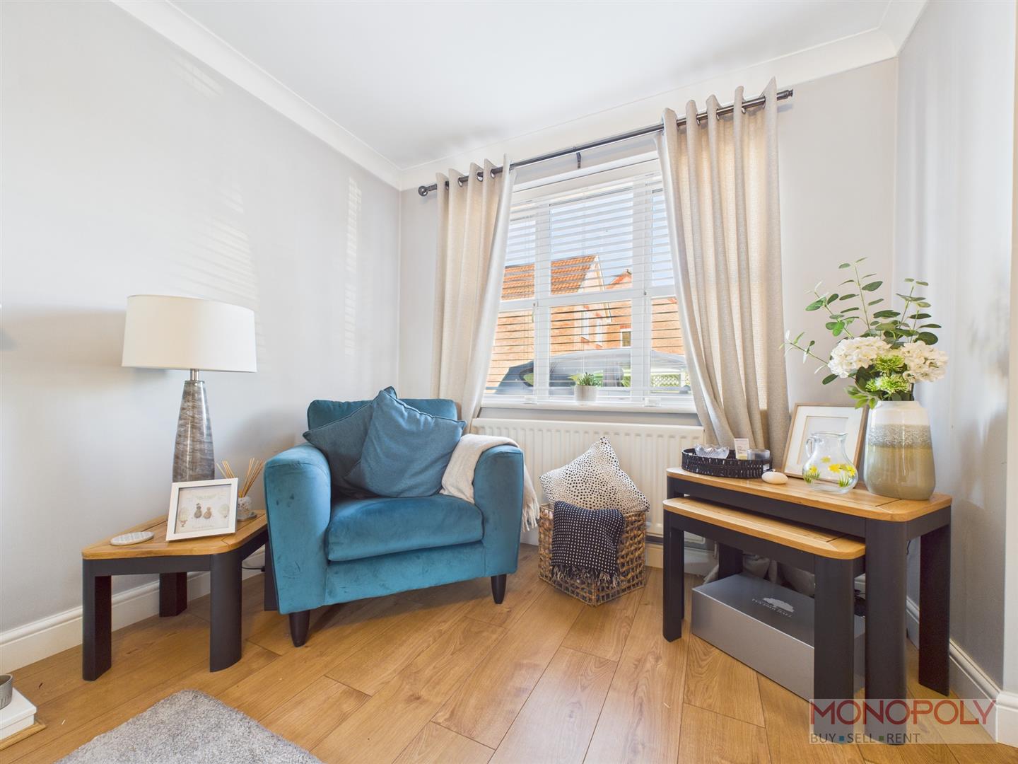 UPVC double glazed window to the front elevation with venetian blinds. Electric fire with wooden surround, wooden laminate flooring, ceiling light point, coved ceiling, ceiling light point, radiator and door into kitchen/dining area.