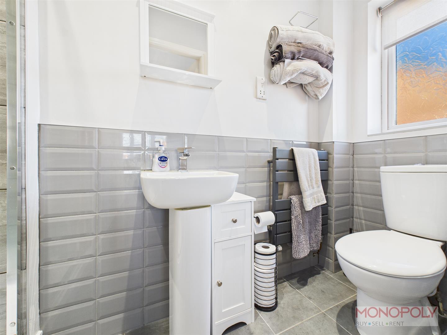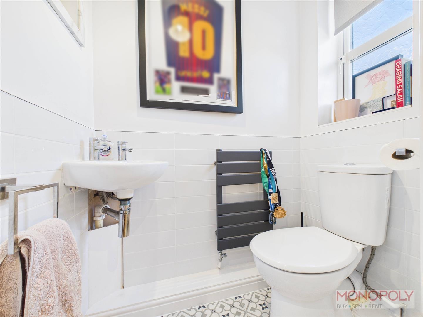 Two piece suite comprising low-level WC and wash hand basin. Tiled flooring, heated towel rail, 1/2 tiled walls, ceiling light point and uPVC double glazed frosted window to the front elevation.