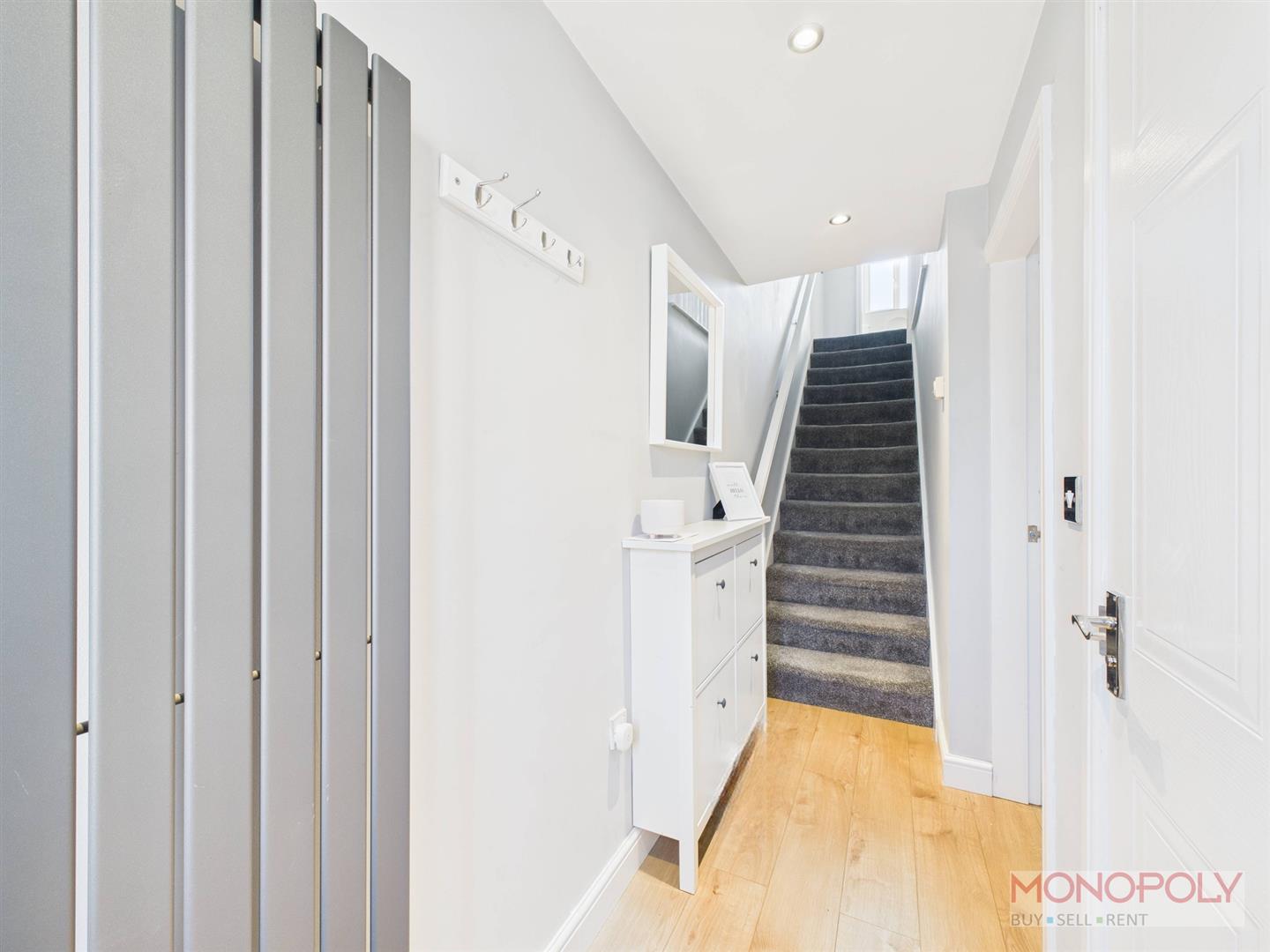 Composite door leads to entrance hallway with vertical radiator, wooden laminate flooring, recessed LED lighting, stairs to first floor, doors to living room and downstairs WC.