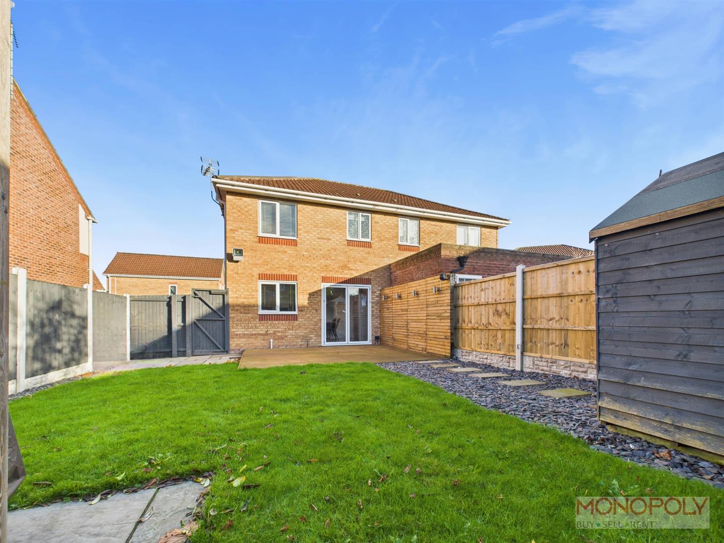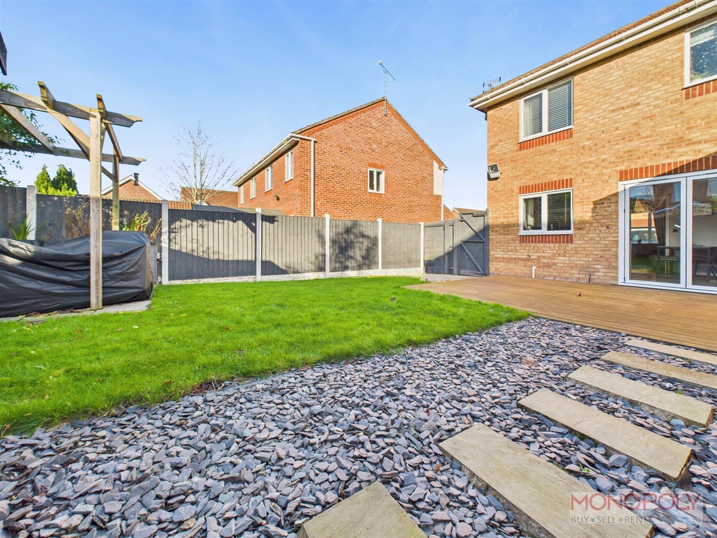 Situated in the popular Fairways development is this beautifully presented three-bedroom semi-detached home, maintained to an excellent standard throughout. The property offers modern, family-friendly accommodation with a bright and spacious feel. In brief, the ground floor comprises an entrance hallway, convenient downstairs WC, a generous living room, and a contemporary kitchen/dining room featuring bi-fold doors that open directly onto the rear garden, creating an ideal indoor–outdoor entertaining space. To the first floor, the landing leads to three well-proportioned bedrooms and a stylish family bathroom, with the principal bedroom further benefiting from its own en-suite shower room. Externally, the property enjoys patterned concrete frontage and a tarmacadam driveway to the side providing ample off-road parking. The rear garden is well arranged, mainly laid to lawn with two patio seating areas, a timber pergola, slate-chipped section and a useful storage shed. Woburn Close is a quiet cul-de-sac within the sought-after Fairways estate, positioned between the highly regarded areas of Borras and Acton. The area is popular with families due to its peaceful environment, easy access to green spaces and proximity to well-regarded schools. A range of local amenities are close by, including Borras shops, a Co-op, pharmacy, takeaways, a post office, and community facilities. Acton Park and surrounding woodland walks are also within easy reach, offering attractive outdoor space. The location provides excellent transport links with convenient access to the A483, Wrexham Industrial Estate, Chester and Wrexham City Centre. Regular bus services run nearby, and the wider area offers supermarkets, leisure facilities and eateries within a short drive. A modern, well-presented home in a quiet and convenient location.
