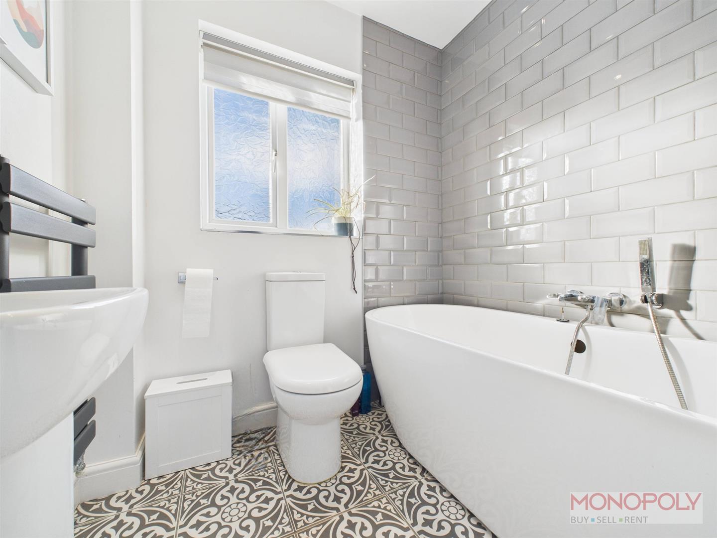 Three piece suite comprising low-level WC, pedestal wash hand basin and freestanding oval shaped bath with shower hose. Tiled floor, part-tiled walls and sill, heated towel rail, extractor, recessed LED lighting and uPVC double glazed frosted window to the rear.
