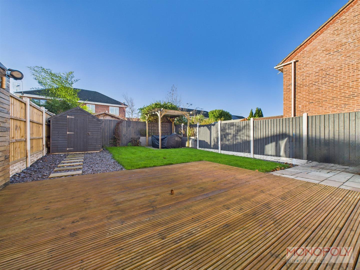 To the front there is a patterned concrete driveway with space for two vehicles. There is an additional space alongside the property with space for a further two vehicles. There is access to the rear garden via a timber gate and fencing where you will find a pleasant garden area comprising of decking, lawned garden, slate chipped area, timber shed and additional patio area with timber pergola. Additionally there is an outside tap, up and downs lighting along with fencing to the boundaries offering privacy and security.