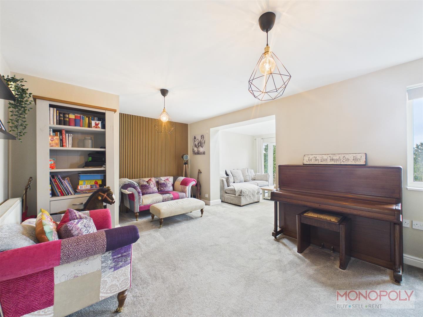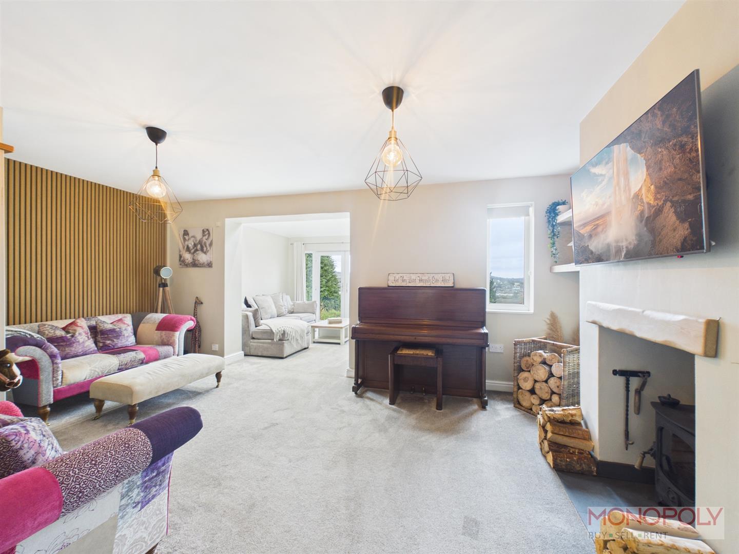 Cosy living room with fireplace, alcove shelving, radiator, carpet flooring, ceiling light point, uPVC double glazed window to the front elevation and opening into sitting room and kitchen.