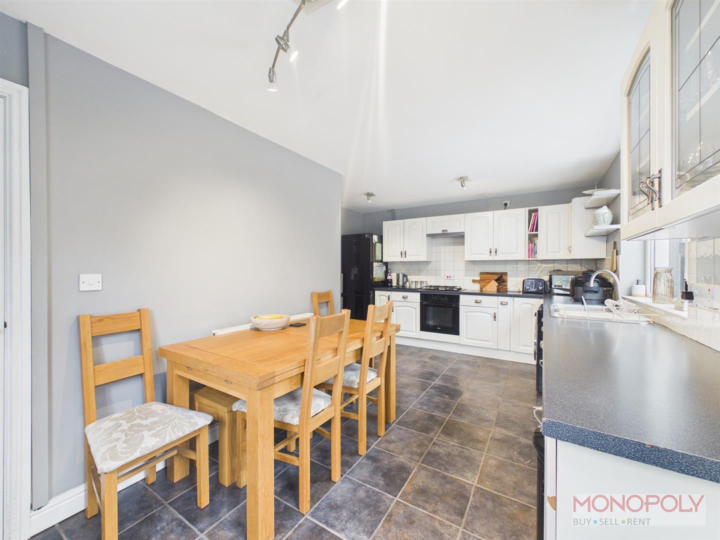 The kitchen has an open-plan layout with space for a dining table, radiator, ceiling light point, door leading into entrance hallway, uPVC double glazed window to the front elevation and uPVC external door to the rear of the property.