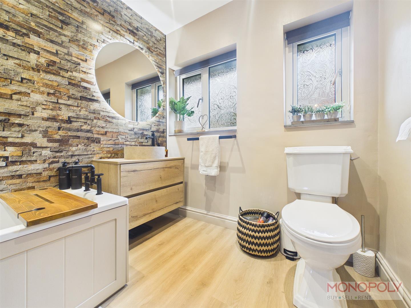 A contemporary three-piece suite comprising a low-level W.C. with dual flush, hand wash basin set in a vanity unit with tap over and panelled bath with rainfall shower head over. Heated towel rail, ceiling spotlights, extractor fan and two uPVC double glazed windows to the rear elevation.