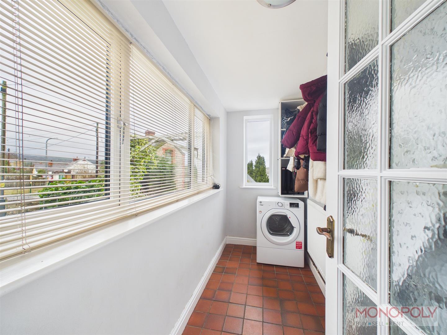 UPVC double glazed window to the front and side elevation, radiator, plumbing for a washing machine and tiled flooring.