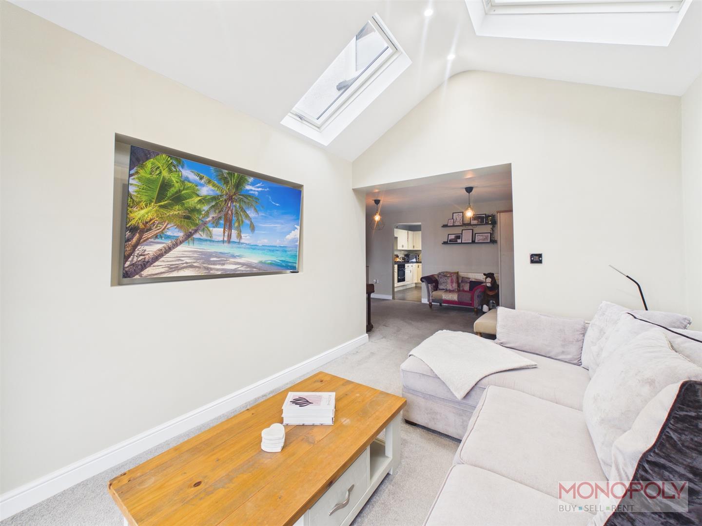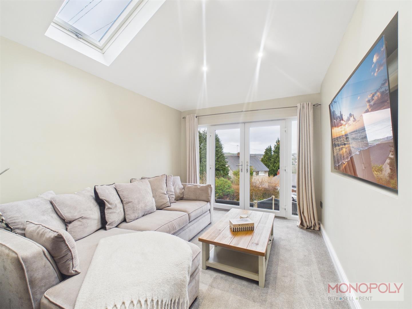 Bright sitting room with skylights and ceiling spotlights, ceiling light point, carpet flooring and uPVC French doors to the front elevation.