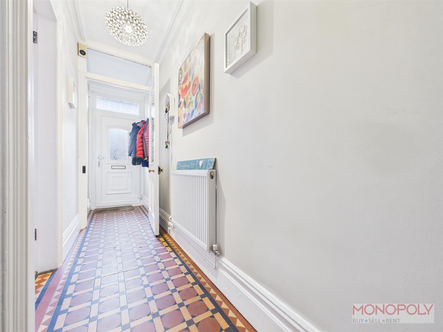 Continuation of original tiled flooring, panelled radiator, ceiling light point, stairs to first floor and doors into living room and sitting room.