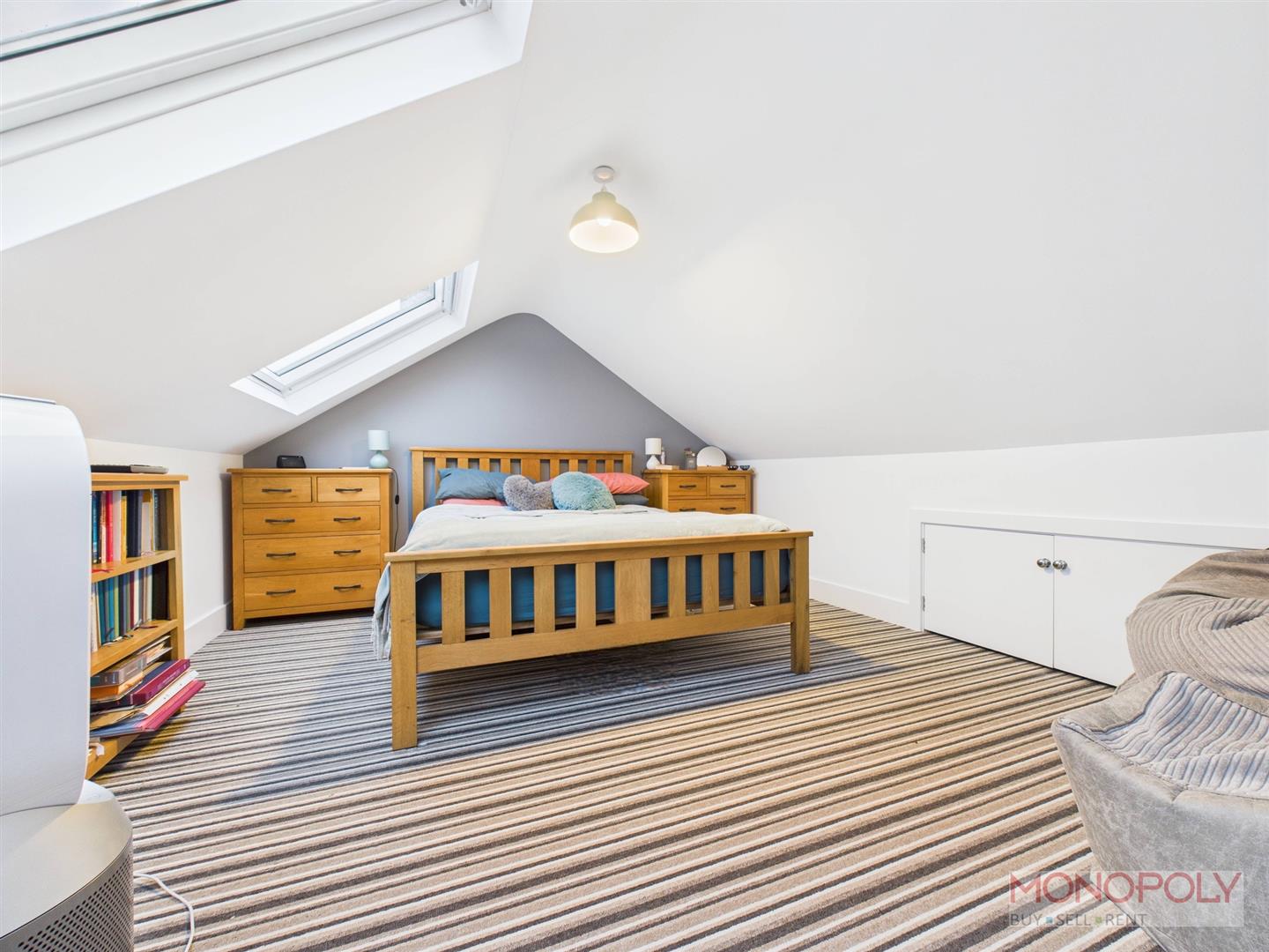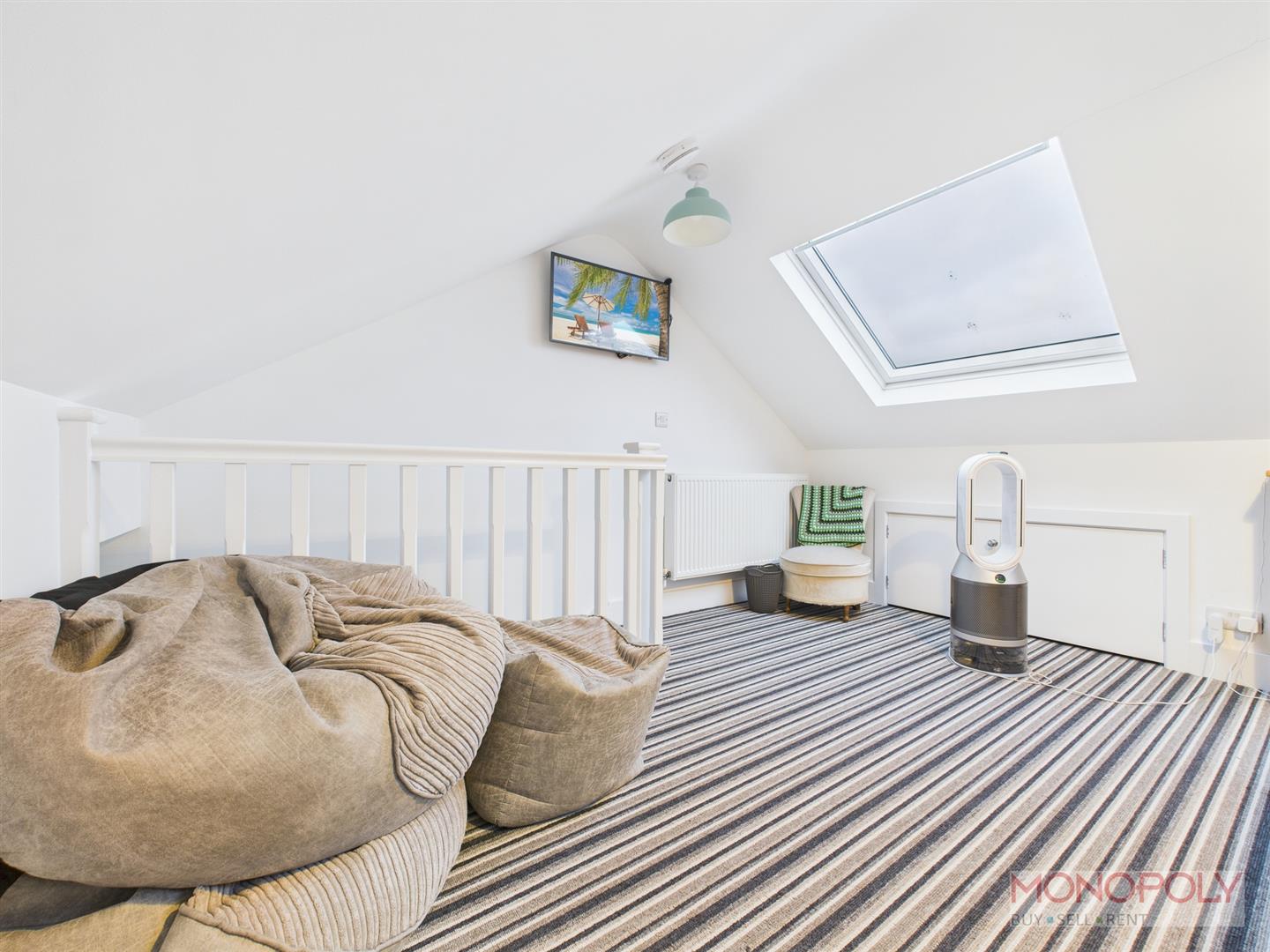 Stairs from first floor landing lead to loft space and bedroom one with two Velux sky light windows having far-reaching views. Fitted eave storage, carpet flooring, panelled radiator and two ceiling light points.