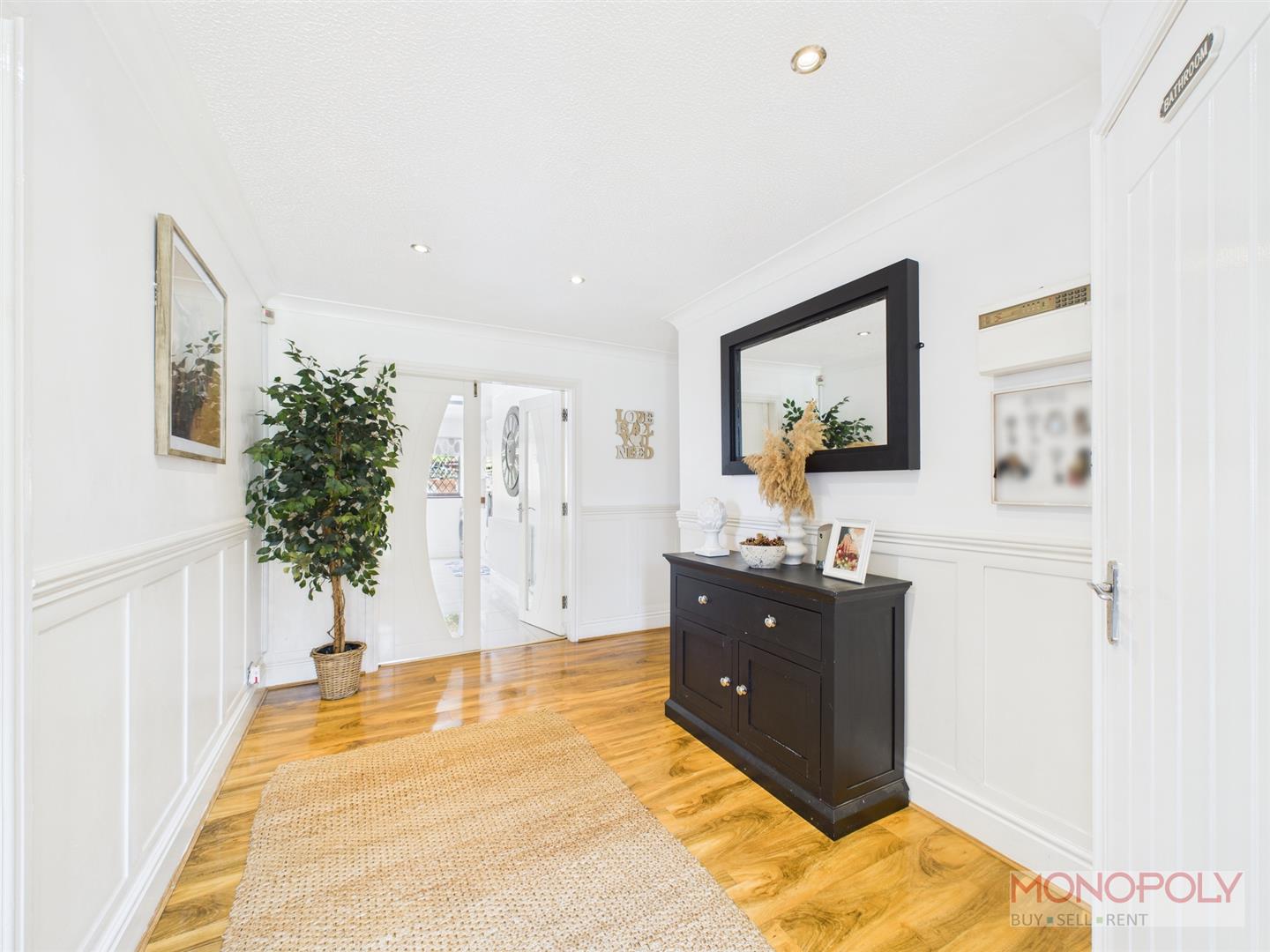 Composite entrance door, woodgrain-effect laminate flooring, double-door cloaks/storage cupboard with lighting, doors lead to the cloakroom WC, all three bedrooms, and the family bathroom. Glazed doors open to both the kitchen/dining room and the living room.