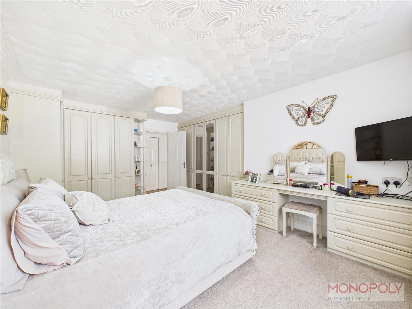 Fitted with a range of units including wardrobes with mirrored inserts, a dressing table, bedside cabinets, and a corner unit. A rear-facing window has a radiator below, and a door opens to the en-suite shower room.