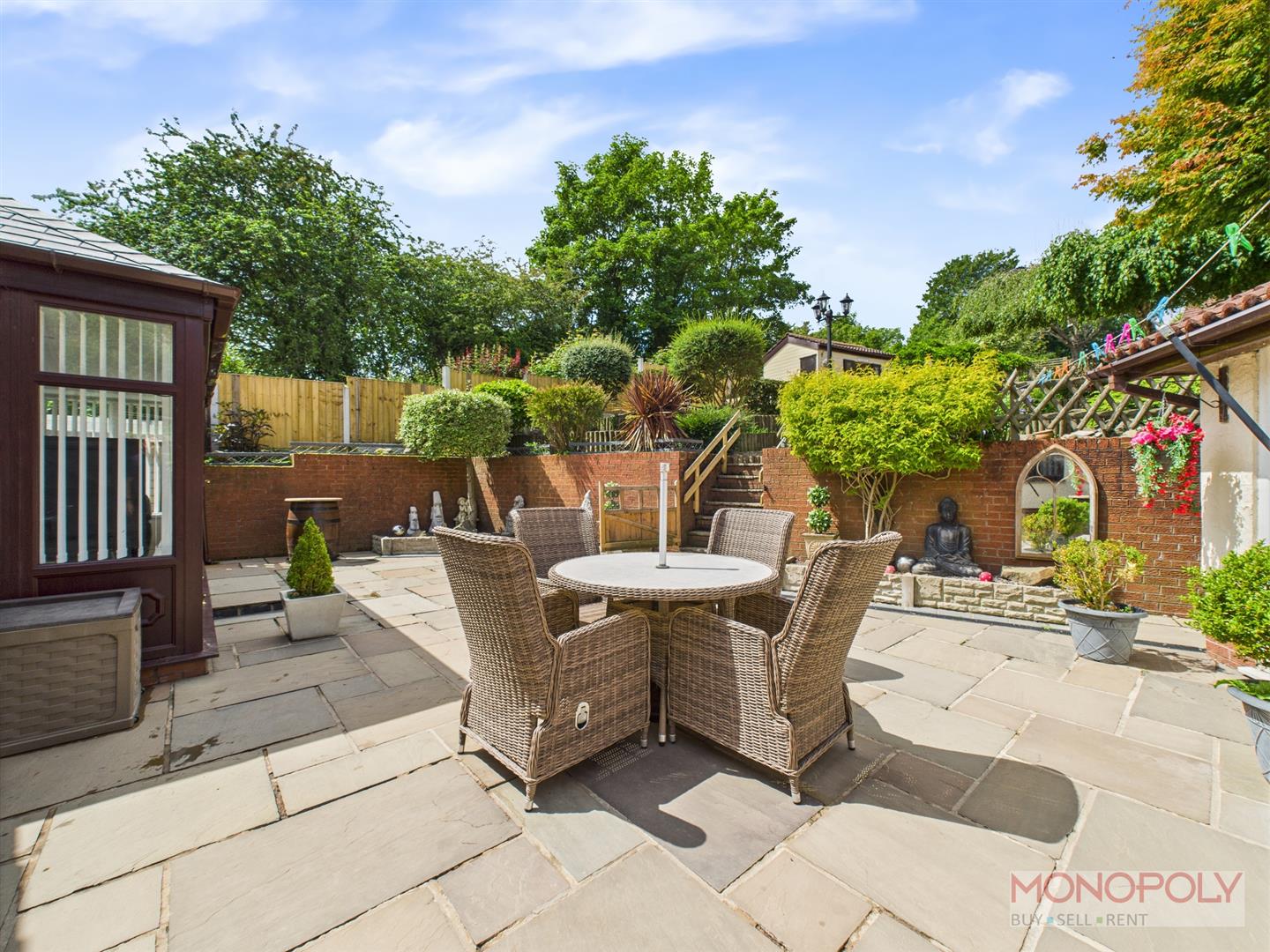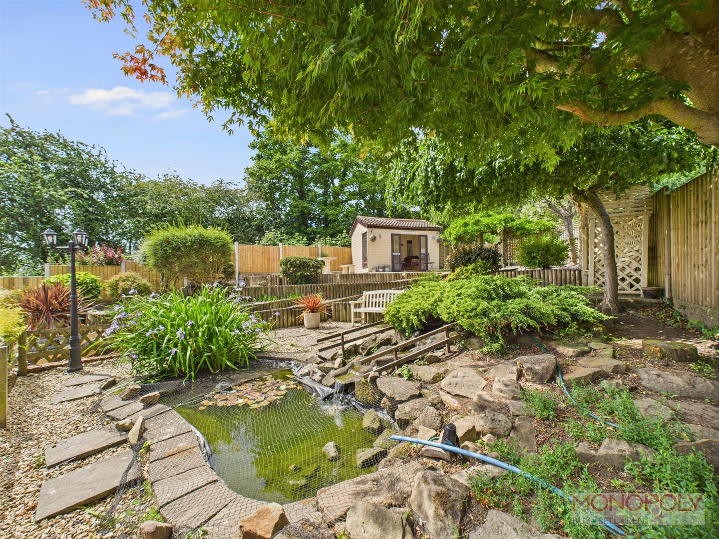 The property is accessed via double timber gates for vehicles or a separate pedestrian gate. Both lead to generous off-road parking that runs along the right-hand side of the property to an oversized garage. There is timber side access leading to the rear garden, along with external water supply and lighting. The front garden is beautifully presented, predominantly laid to lawn, with substantial inset stone areas, mature plants and trees, further outdoor lighting, and a storage area to the left-hand side of the property, which includes a timber shed and an additional water supply. A beautifully landscaped rear garden with timber gated side access. A large patio area leads to steps rising to an elevated, gravelled and paved garden that is well-stocked with a variety of plants, shrubs, and trees. Features include an ornamental pond, a summer house, and a gate opening to a further lawned garden area with mature trees, a paved patio, and two greenhouses. The garden is fully enclosed by timber fencing.