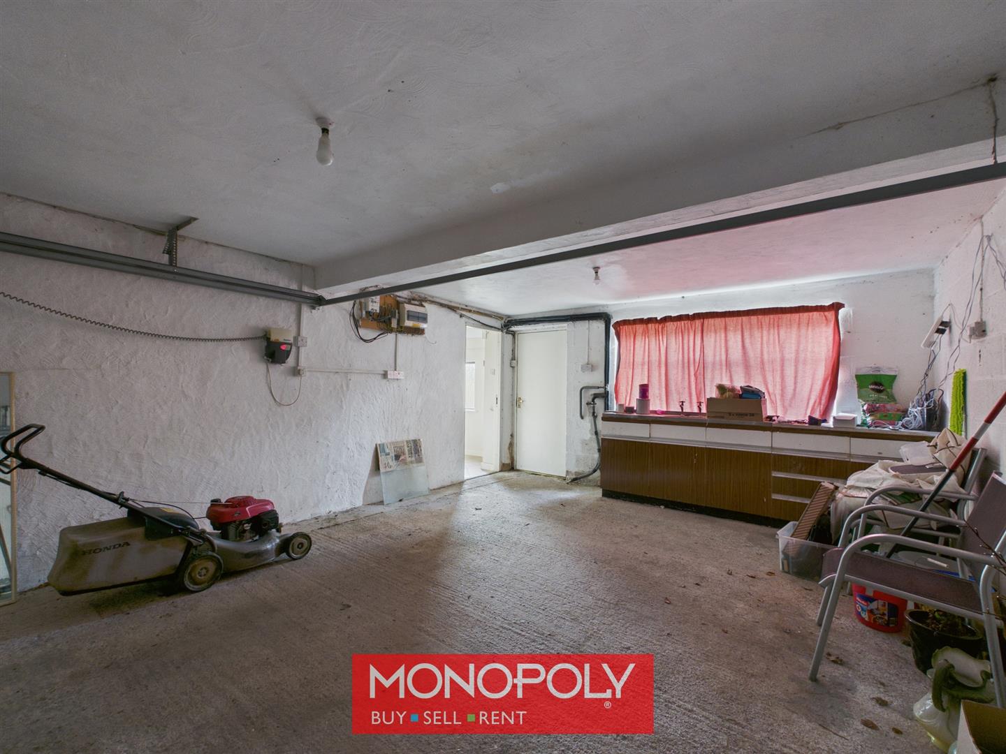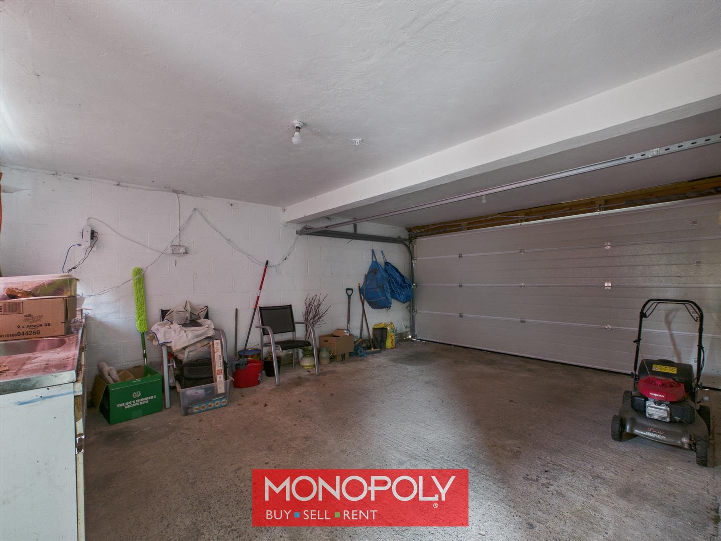 The garage is a useful and practical space, fitted with a concrete floor and accessed via an up-and-over door. It benefits from fitted cabinetry, a stainless steel sink with a large rear-facing window above, and an external door leading out to the rear. An internal door provides access to the outer hallway, while the consumer unit is also located within the garage.