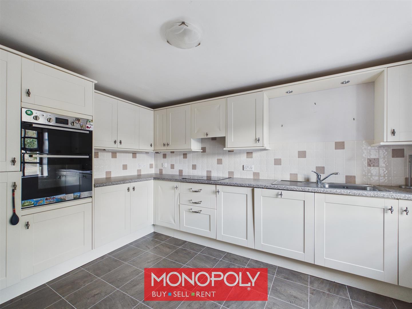 The kitchen is fitted with cream cabinetry and speckled worktops, with laminate tile-effect flooring providing a practical finish. It is well equipped with an eye-level oven and grill, a four-burner induction hob with a concealed extractor hood above, and integrated appliances including a fridge freezer and dishwasher.