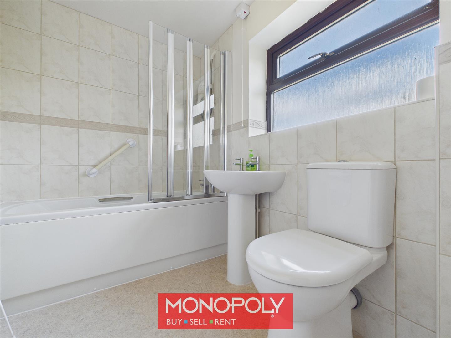 The bathroom is fitted with a bath with overhead shower and glass screen, alongside a wash basin and toilet. Finished with vinyl flooring and partially tiled walls, it also includes a radiator and an obscure double glazed window to the rear.