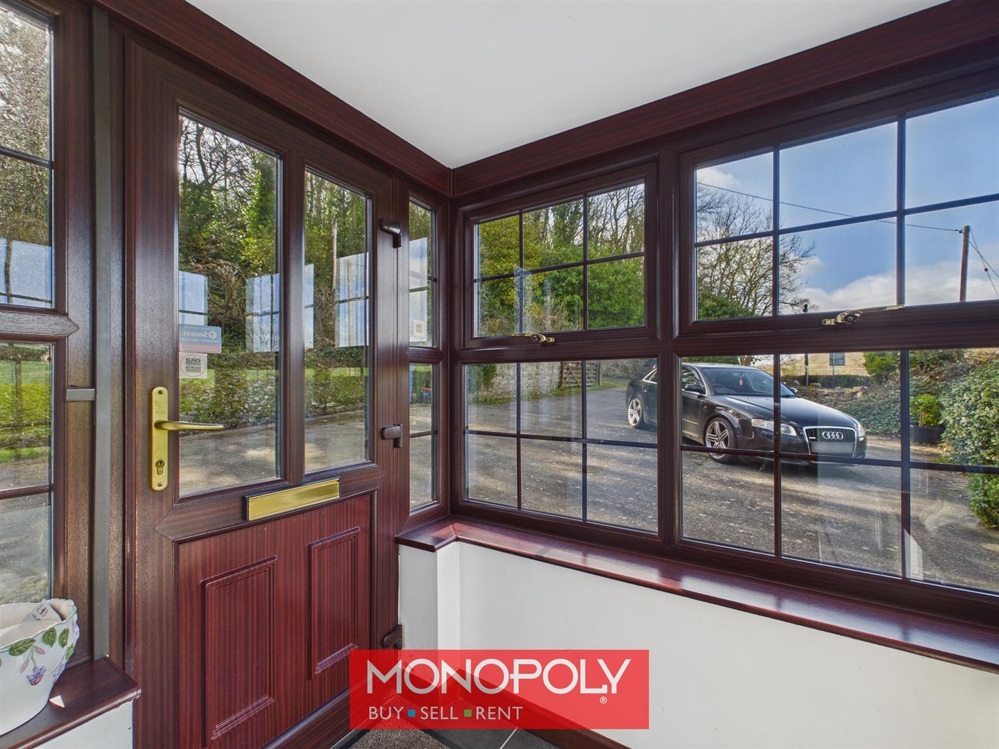 The entrance vestibule provides a practical and welcoming introduction to the home, featuring tiled flooring, partial walls with double glazed windows, and a uPVC front door with glazed panelling. An internal wooden door leads through to the lounge.