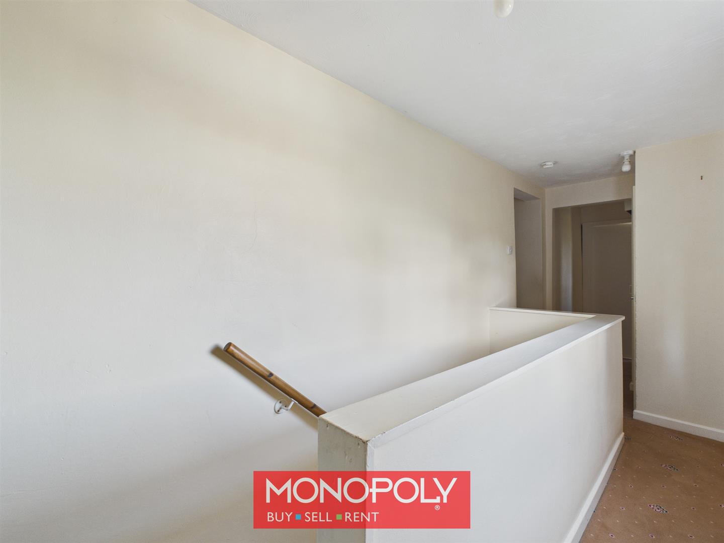 The first floor landing is carpeted and provides access to all bedrooms and the bathroom. It includes a radiator, a built-in storage cupboard, an airing cupboard with sliding door, a rear-facing double glazed window and multiple ceiling lights, creating a bright and functional central space.