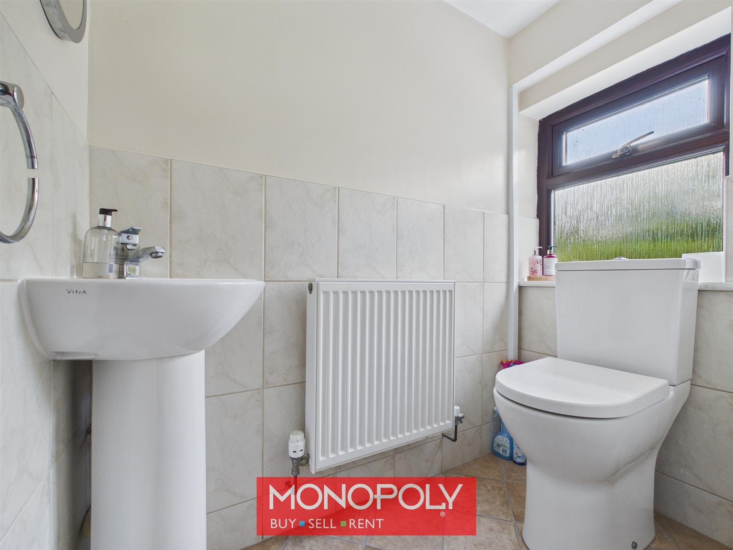 The ground floor WC is fitted with vinyl tile-effect flooring, partially tiled walls, a corner hand basin and toilet. An obscure double glazed window to the rear and a radiator complete the room.
